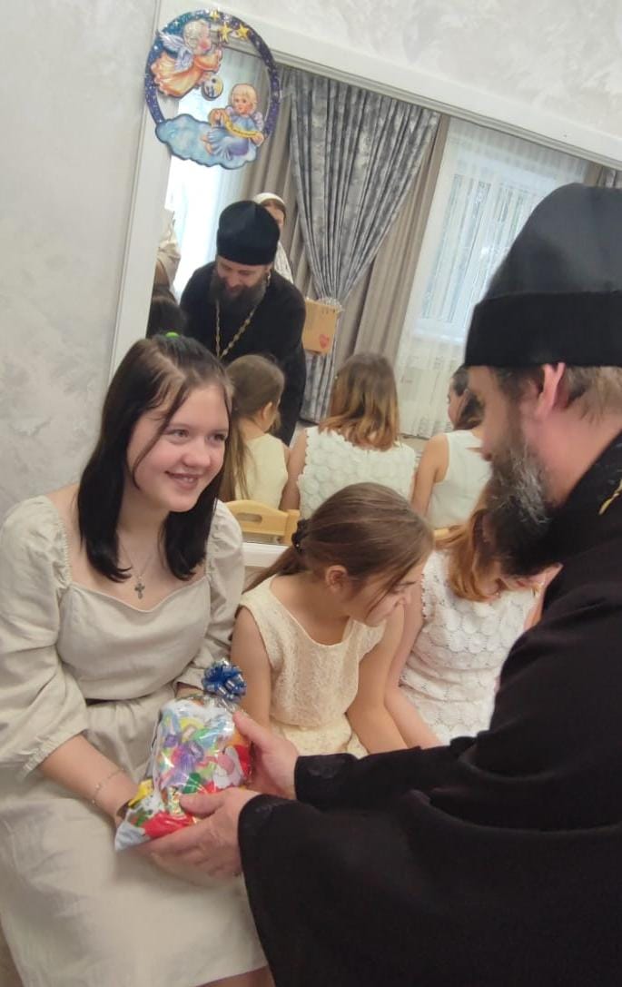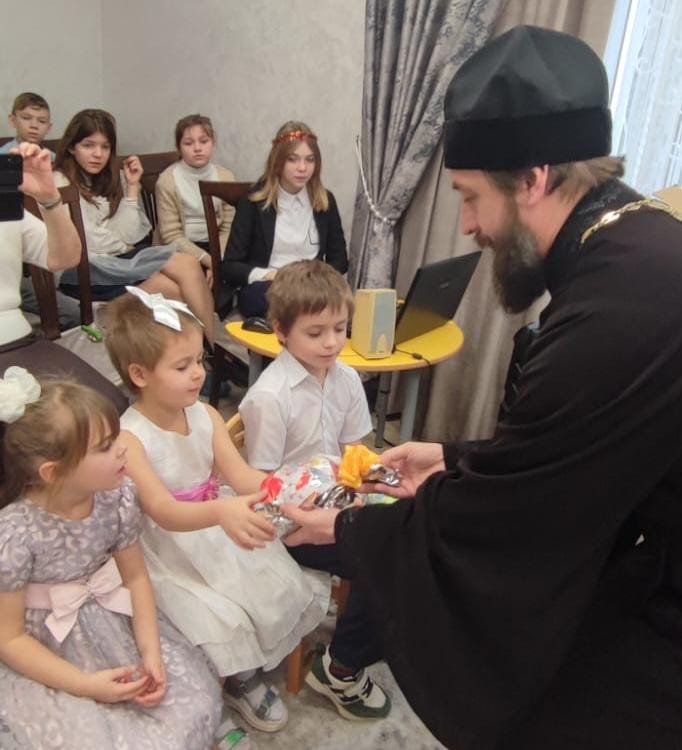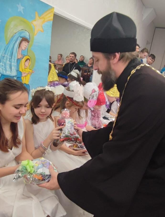 Протоиерей Сергий поздравил ребят с Рождеством Христовым и подарил каждому сладкий подарок.
