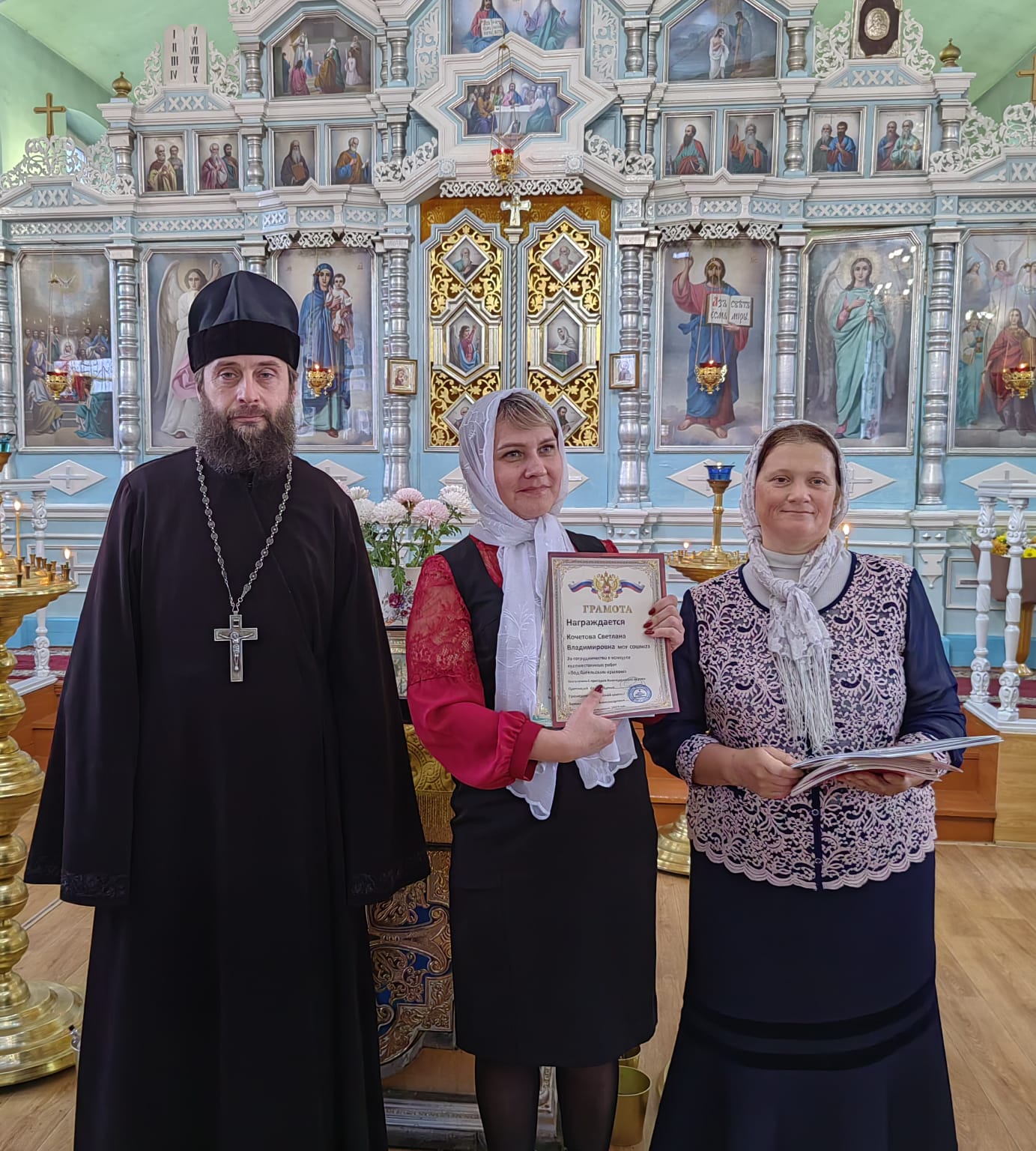 Настоятель храма, благочинный приходов Нижнедонского округа протоиерей Сергий Яценко поздравил учащихся воскресной школы и воспитанников социального приюта для детей и подростков Октябрьского района «Огонек», активно принявших участие в конкурсе, подарил каждому ребёнку подарок и пожелал дальнейших творческих успехов.