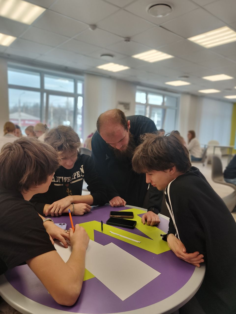 Отец Никита предложил молодым людям не привычный формат лекции, а живой, динамичный диалог. В самом начале встречи участники разделились на команды, и каждая из них получила возможность не просто слушать, но и активно формировать ход разговора, предлагая свои версии и аргументы.