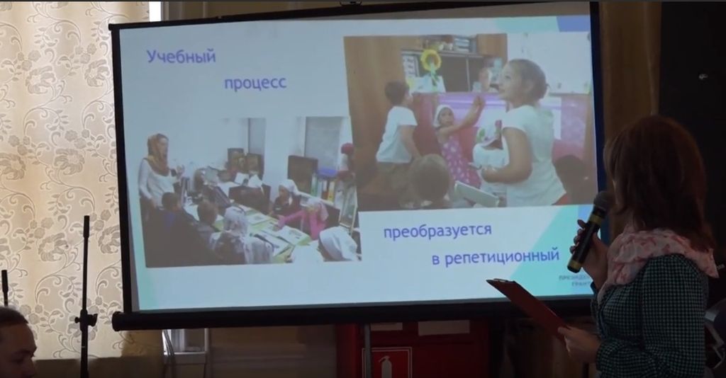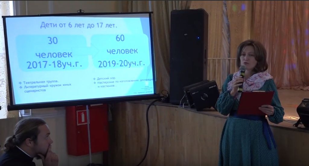 Вниманию присутствующих была предложена презентация проекта-победителя Второго конкурса президентских грантов 2019 г. «Учебный театр «Воскресение» с комментариями и пояснениями директора Воскресной школы Свято-Пантелеимоновского прихода г. Гуково Т.Ю. Дубовик. Именно на базе этой школы осуществляется проект, поддержанный Фондом президентских грантов. Данный опыт работы педагогов вызвал не поддельный интерес у слушателей.