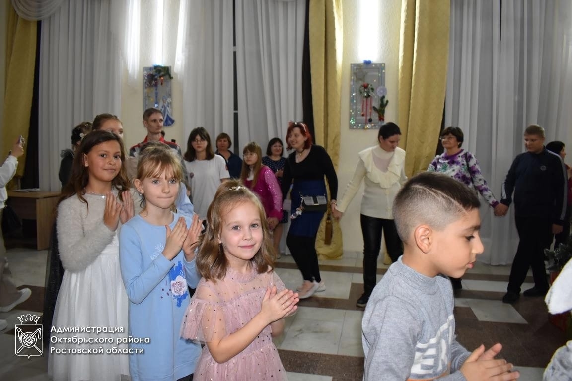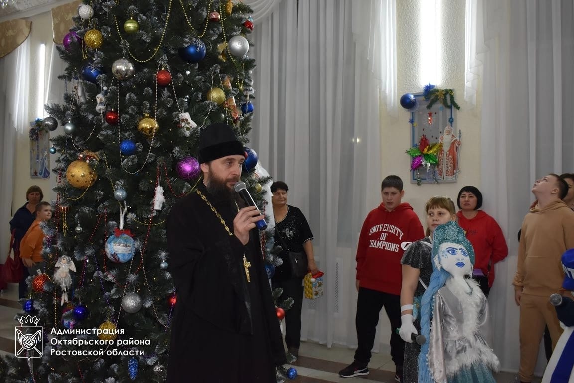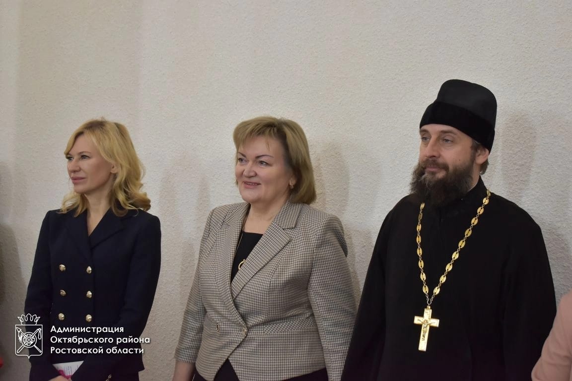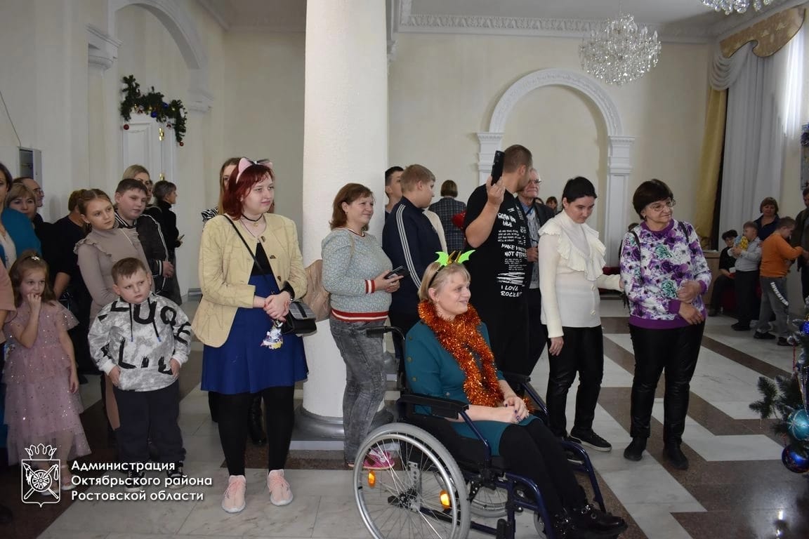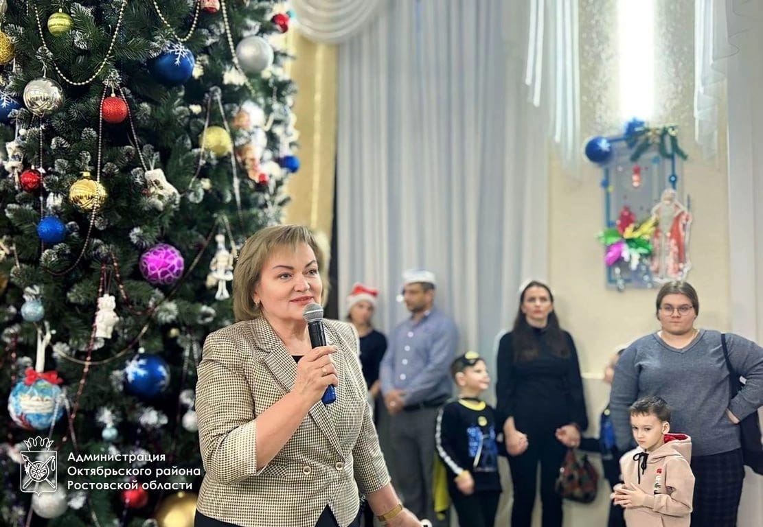 Глава Администрации Октябрьского района Людмила Овчиева, депутат Государственной думы Федерального собрания Российской Федерации Екатерина Стенякина, заместитель председателя Собрания депутатов Октябрьского района Наталья Злобина, благочинный приходов Нижнедонского округа протоиерей Сергий Яценко приняли участие в новогоднем представлении для солнечных детей «В гостях у новогодней сказки».