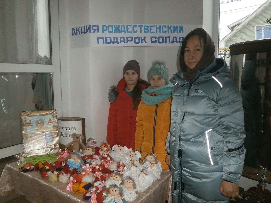 Средняя группа защитила проект «Николай Чудотворец». На творческом часе по изготовлению Рождественского сувенира и открыток для военнослужащих под руководством преподавателей Давидовой Н.Г. и Живенко И.Ю. дети записали обращение к воинам-защитникам родной земли и веры. В храме провели акцию «Рождественский подарок солдату», в ходе которой прихожане, получая сувениры, изготовленные детскими руками, осуществляли посильные пожертвования, на которые приобретены подарки для вручения солдатам.