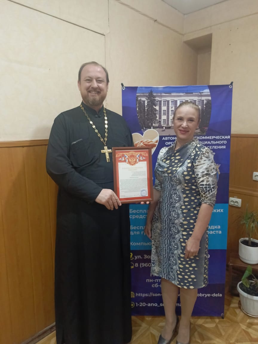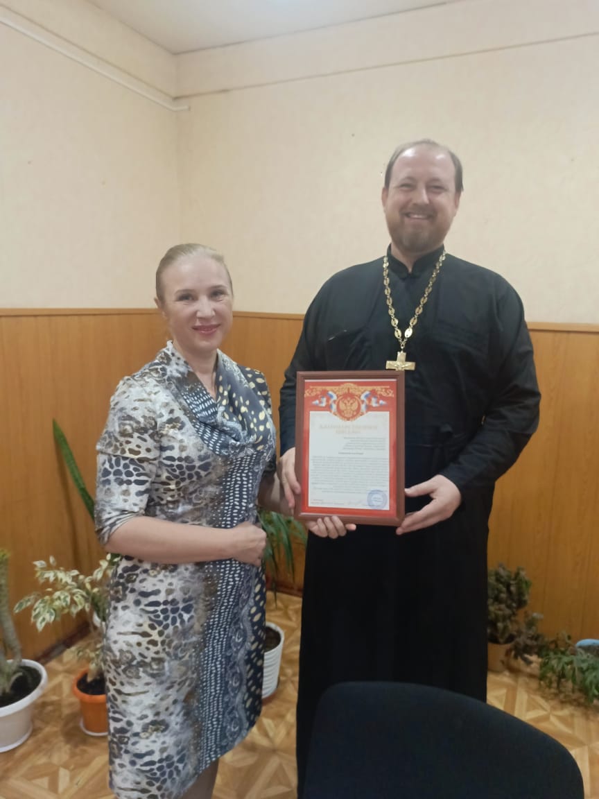 В ходе встречи Любовь Васильевна выразила благодарность и вручила протоиерею Роману Амплееву благодарственное письмо за совместное соработничество и помощь пожилым благополучателям.