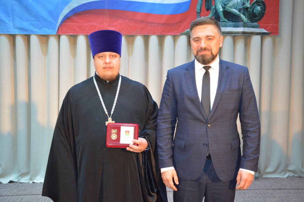 Юбилейный Памятный знак «100 лет Каменскому району», который вручается гражданам, обеспечившим своим трудом социально-экономическое и духовно-нравственное развитие Каменского района, Владимир Савин вручил настоятелю храма Успения Пресвятой Богородицы станицы Калитвенской иерею Игорю Лосеву.