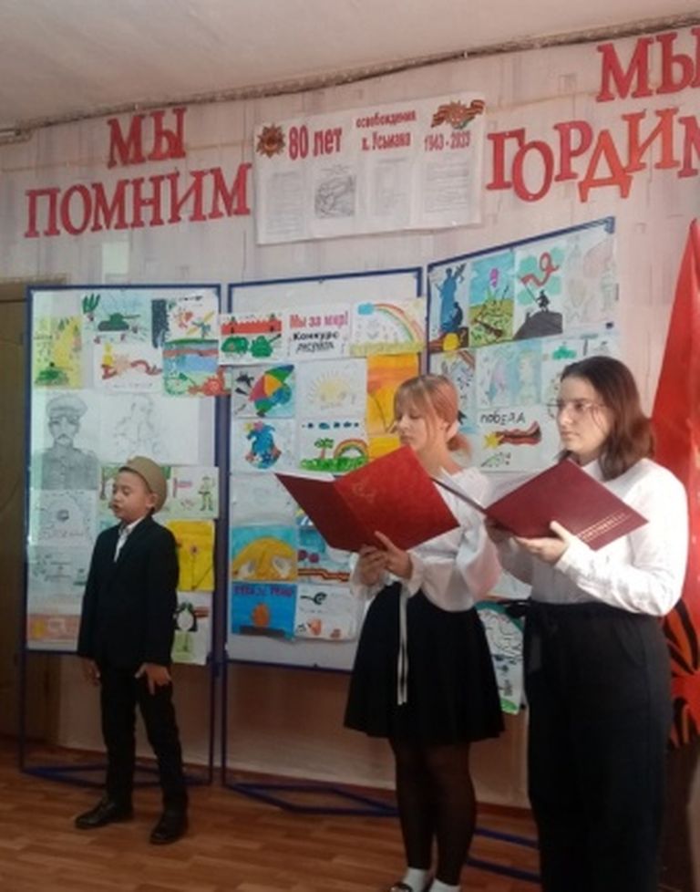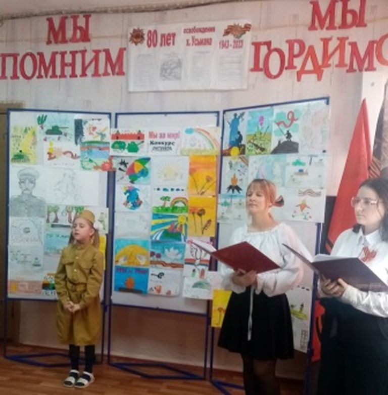 В Усьманской школе Багаевского района 3 февраля прошло завершающее мероприятие Дней Памяти, посвященных 80-летию освобождения хутора Усьман от немецко-фашистских захватчиков. В течение десяти дней проходили экскурсии по школьному музею, которые проводила помощник настоятеля по образованию Бурим Е.Б., также учащиеся приняли участие в конкурсе рисунков «Мы за мир!» и конкурсе чтецов «Мы помним! Мы гордимся!».