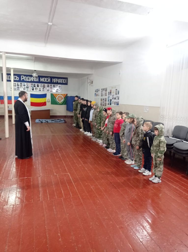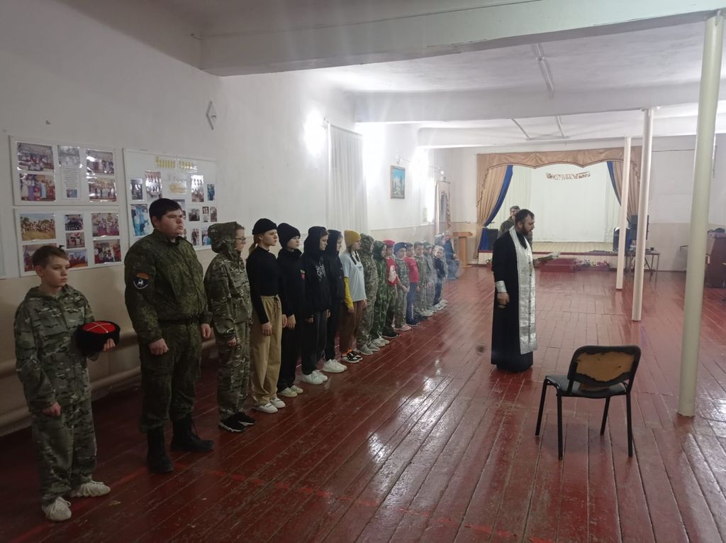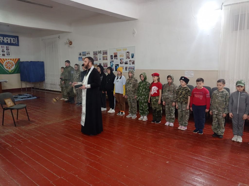 Совершил панихиду настоятель храма великомученика Георгия Победоносца поселка Новозарянский иерей Сергий Липень. После панихиды священник обратился к ребятам и рассказал о важности молитвы за усопших, а также о тех событиях, которые происходили в нашей стране сто лет назад.