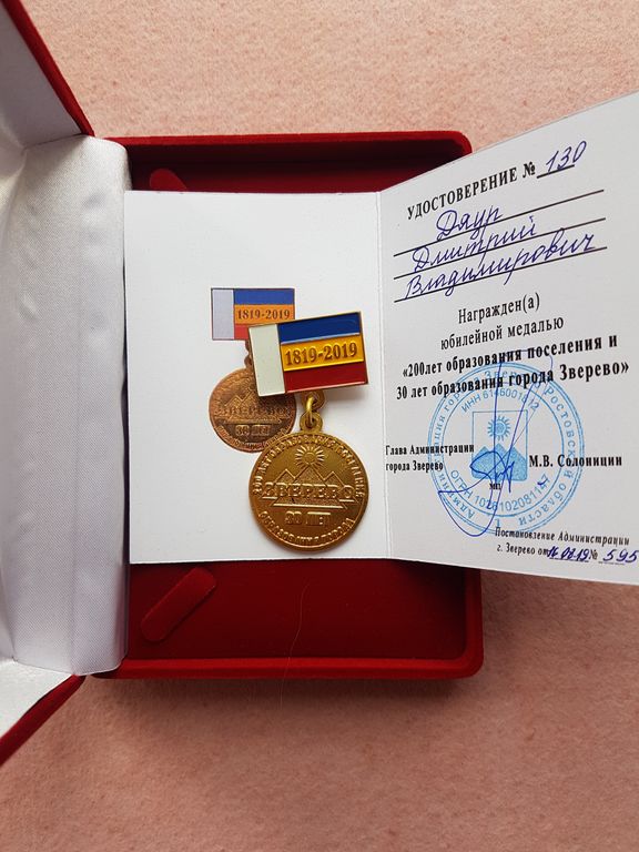 Ко Дню города Зверево Администрацией было принято решение наградить активных жителей юбилейной медалью «200 лет образования поселка, 30 лет образование города».