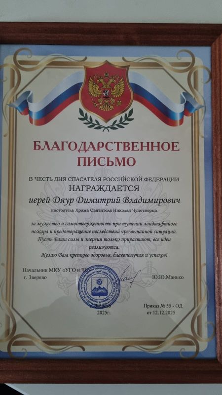 В торжественной обстановке начальник МКУ «УГО и ЧС» г. Зверево Юлия Юрьевна Манько вручила священнику почётную грамоту и благодарность за активное содействие в тушении масштабного ландшафтного пожара и предотвращение серьёзных последствий чрезвычайной ситуации, возникшей в районе этим летом.