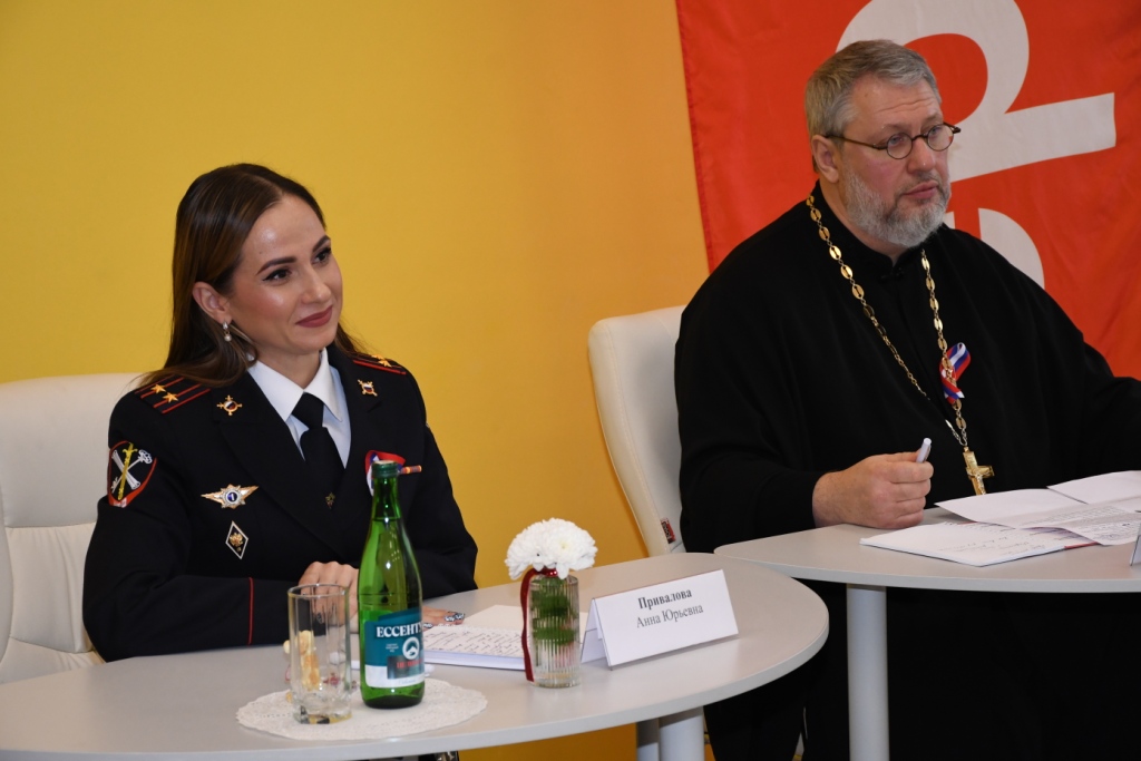 За круглым столом собрались глава администрации Каменского района Владимир Савин, его заместитель по вопросам социального развития Антонина Бесчетнова, заведующая отделом образования Оксана Кандалова, благочинный приходов Каменского округа иерей Владислав Касьянов, начальник отделения информации и общественных связей управления на транспорте МВД России по СКФО подполковник внутренней службы Анна Привалова, заместитель начальника Лиховского линейного отдела МВД России на транспорте полковник полиции Борис Стадничук, настоятель Свято-Успенского храма станицы Калитвенской иерей Игорь Лосев и самые активные члены движения. Глава Каменского района, священники и почетные гости обратились к молодежи с приветственными словами.