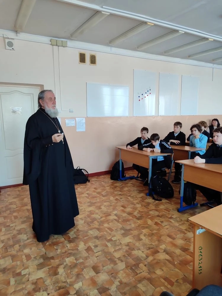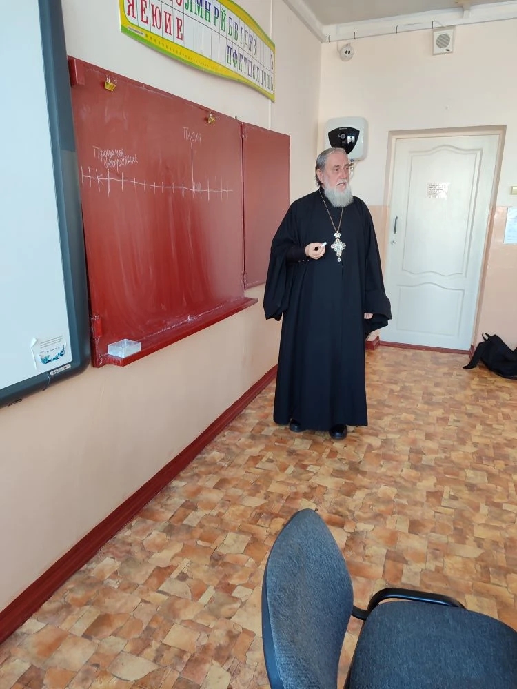 20 февраля 2026 года настоятель храма Сретения Господня ст. Базковской протоиерей Владимир Поляков провел духовную беседу с учениками 7 и 8 классов Базковской СОШ. Священник рассказал школьникам не только о Пасхе, но и о приготовлении к Празднику — о Великом посте. Ребята с интересом слушали рассказ священника, задавали вопросы.