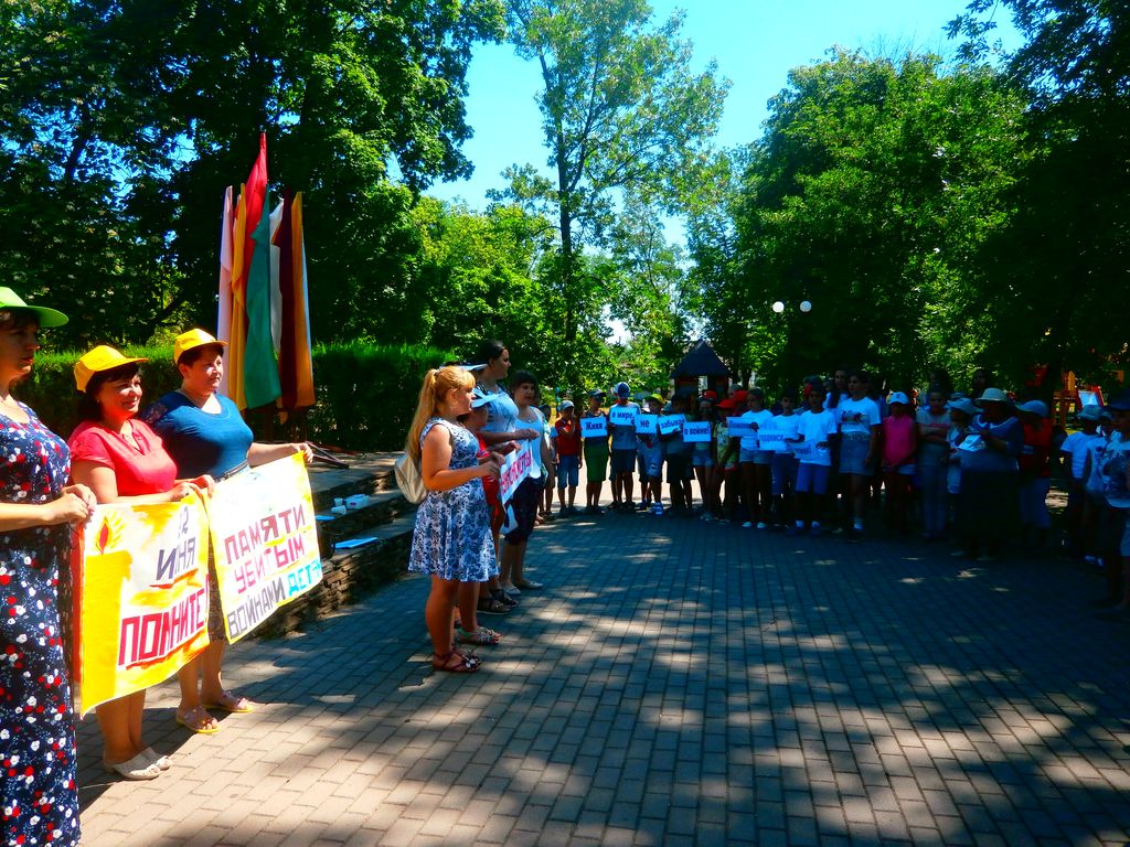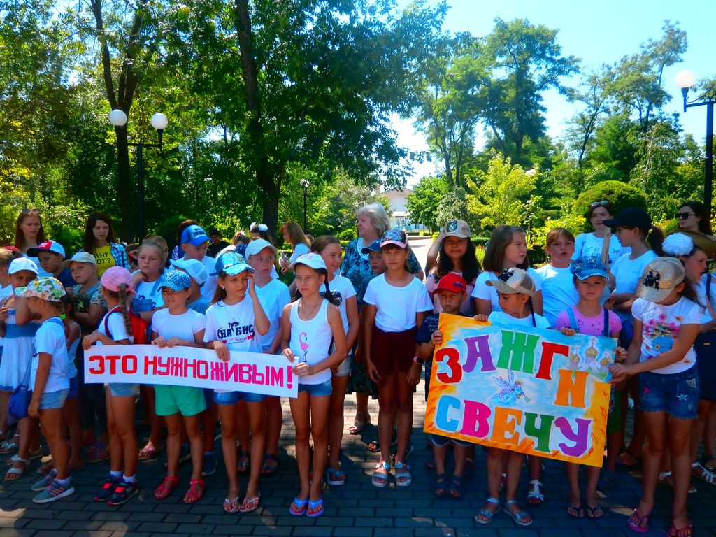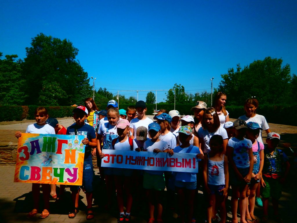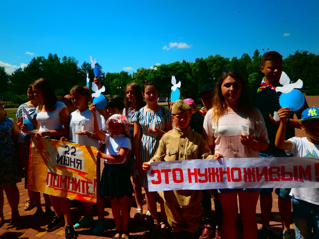 Мероприятие посвящено скорбной исторической дате нашего Отечества – 22 июня 1941 года. В нем приняли участие воспитанники летних школьных лагерей десяти общеобразовательных школ, молодежный отдел Донецкого благочиния, студенты- волонтеры, молодежный родительский духовный клуб «Свет добра» и духовно-просветительский клуб «Веков связующая нить» при детской библиотеке-филиале им. А. Гайдара.