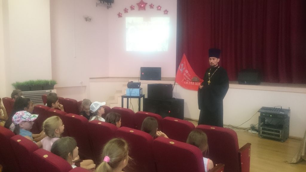 Помощник благочинного Л. Кравцова и заведующая библиотекой им. Платова Е.В. Лопаткина рассказали школьникам о том, как вся страна в далеком 1941 году поднялась на борьбу за свою свободу, как дети помогали взрослым и сражались наравне с ними и показали несколько коротких фильмов: о детях-героях Великой Отечественной войны; о детях, переживших блокаду Ленинграда; о советских солдатах-героях Отечества, самоотверженностью которых восхищались даже враги.