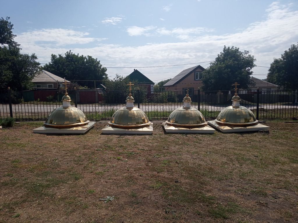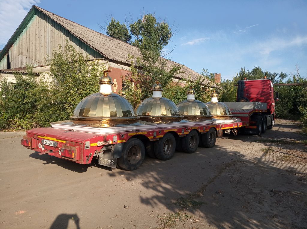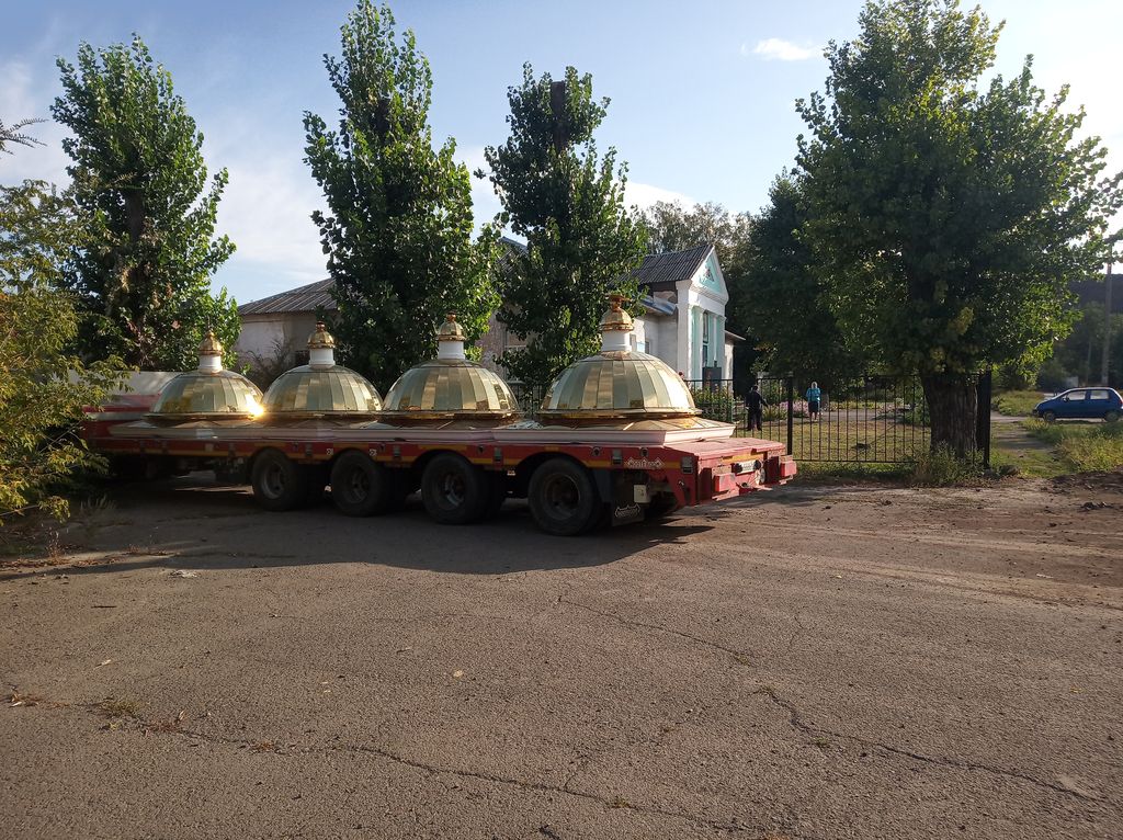 И в начале сентябре купола были доставлены в г. Красный Сулин. Разгрузка велась совместными усилиями всех присутствующих под руководством отца Сергия и его помощника Геннадия Соснова. С Божьей помощью церковное убранство было размещено на территории храма.