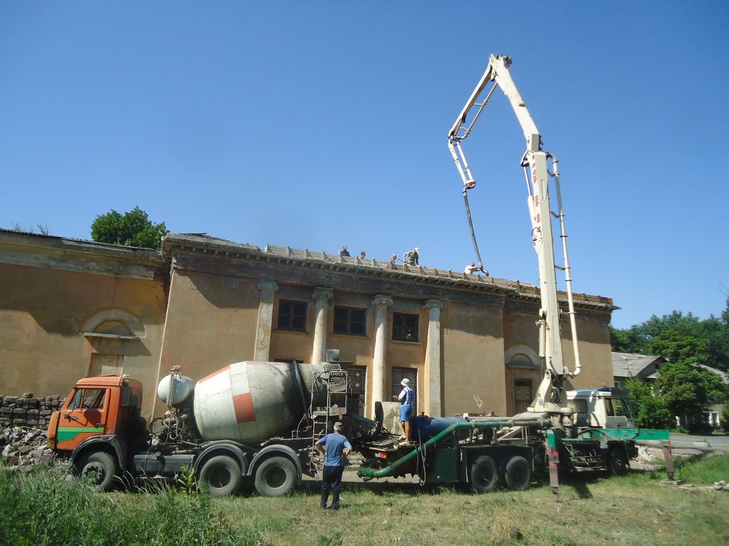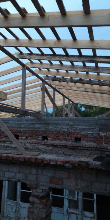 На сегодняшний день выполнены работы по укреплению стен — залит армированный пояс, а также устроена стропильная система и покрыта оцинкованным железом крыша.