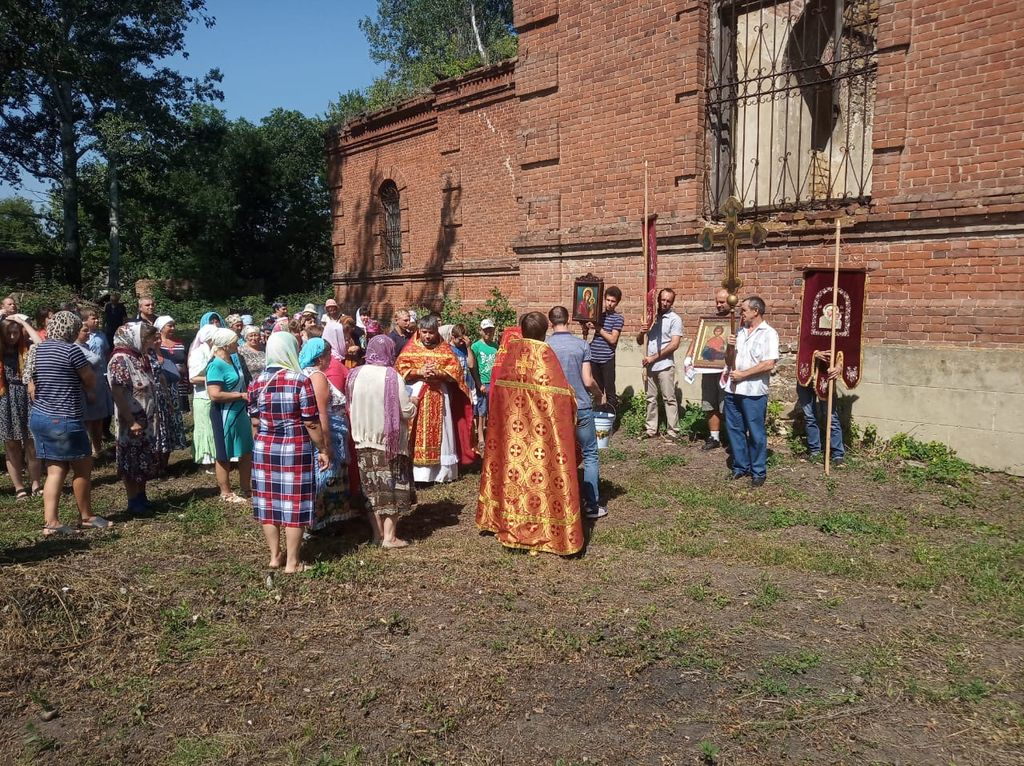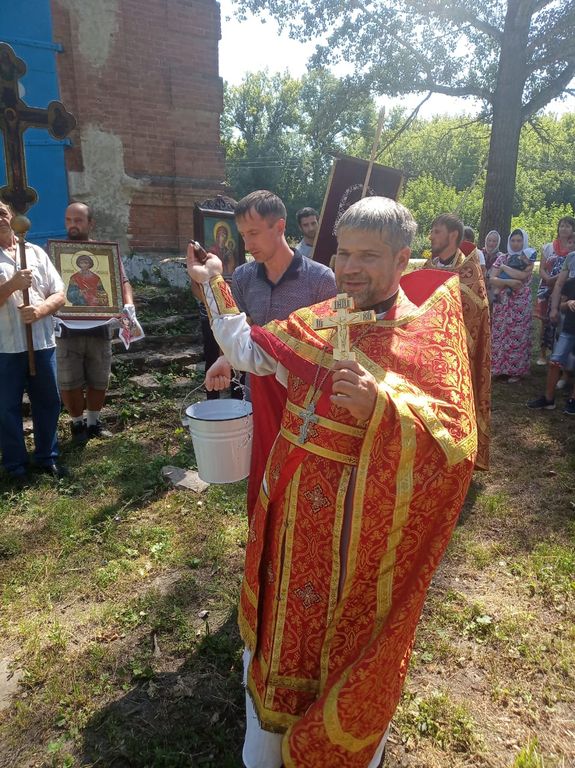 Духовенство и прихожане совершили торжественный крестный ход с хоругвями вокруг разрушенного храма в честь святого великомученика и целителя Пантелеимона.