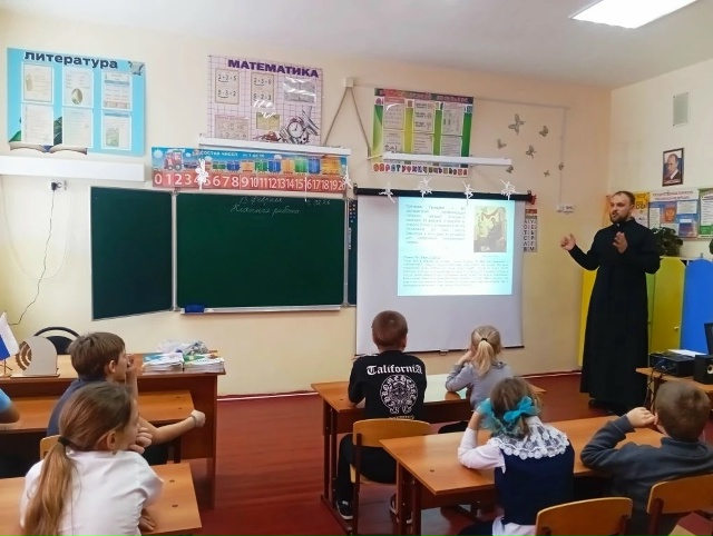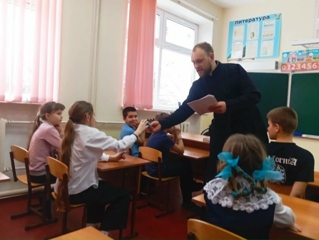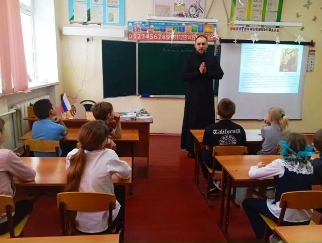 Накануне праздника Сретения Господня в МБОУ «Нижне-Калиновская СОШ» состоялась встреча учащихся начальных классов с катехизатором, помощником благочинного Кашарского округа Михаилом Бурцевым.