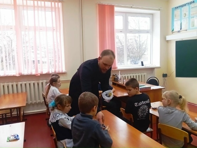 Дети активно задавали вопросы и получили на них содержательные ответы. По окончании встречи катехизатор поздравил учеников и учителей с наступающим праздником Сретения Господня и вручил ребятам сладкие подарки.