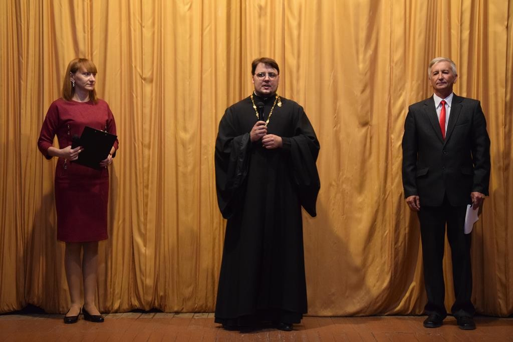 Перед началом концерта к присутствовавшим в зале представителям администрации г. Шахты, а так же учителям и ученикам школ № 22 и № 27 обратился с приветственным словом клирик Никольского храма иерей Николай Налеткин.