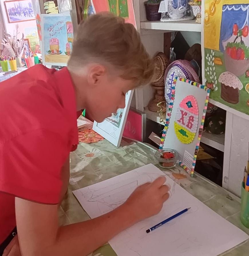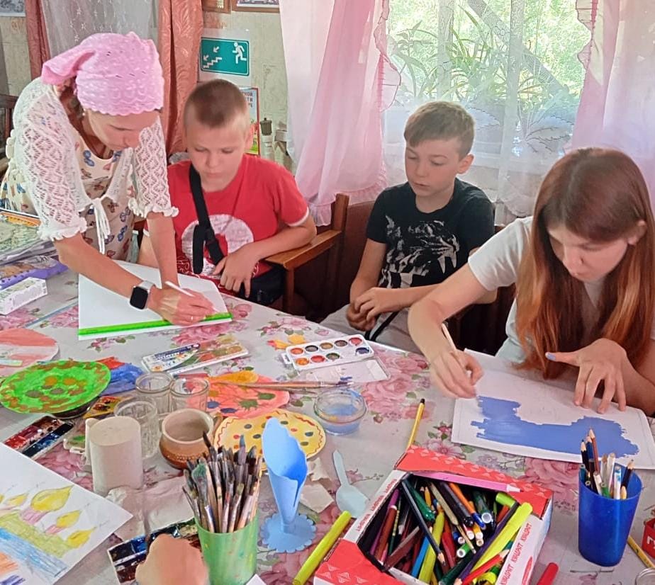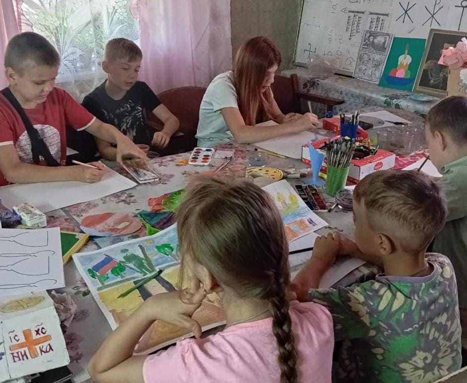 Ребята воскресной школы пишут письма поддержки и рисуют детские рисунки.