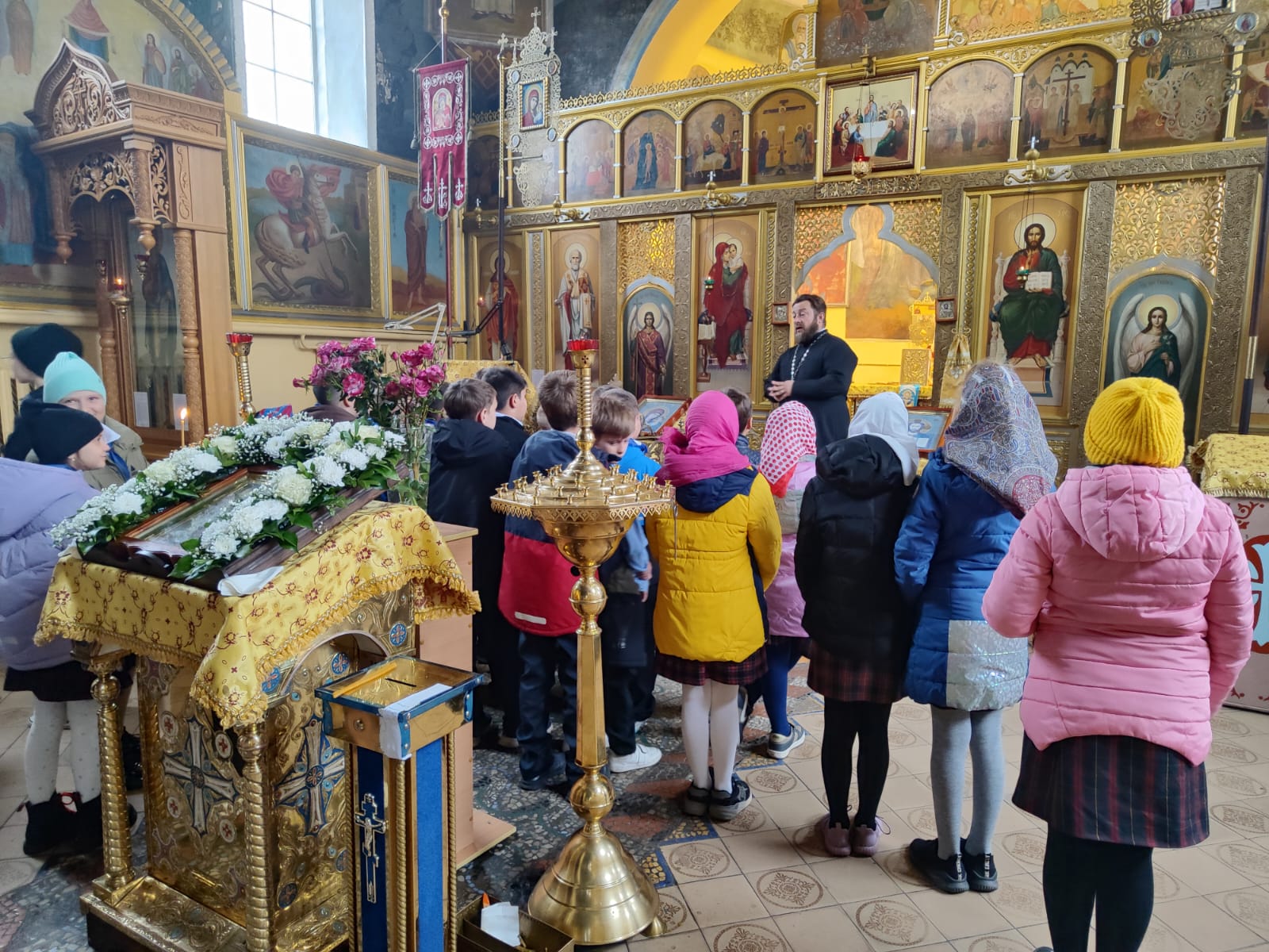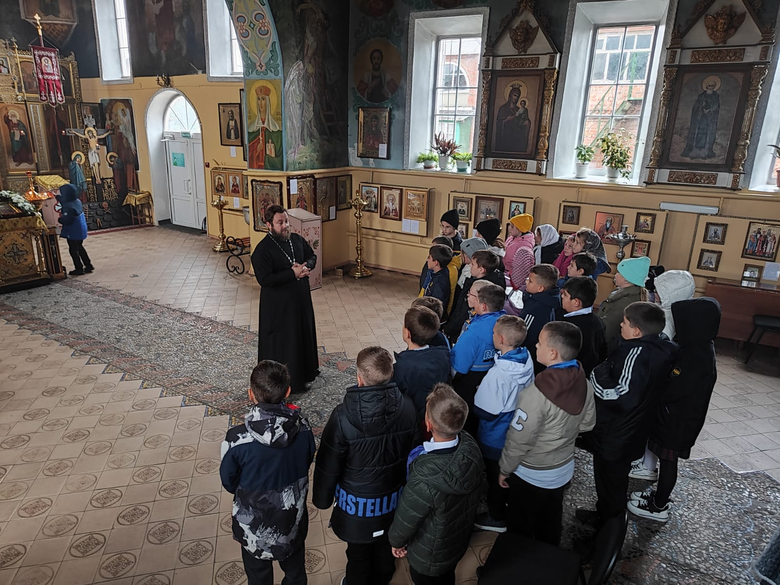 Священник провел для ребят экскурсию по церковному зданию, рассказал об устройстве храма, украшающих его стены иконах, значении праздника Покров Пресвятой Владычицы нашей Богородицы и Приснодевы Марии.