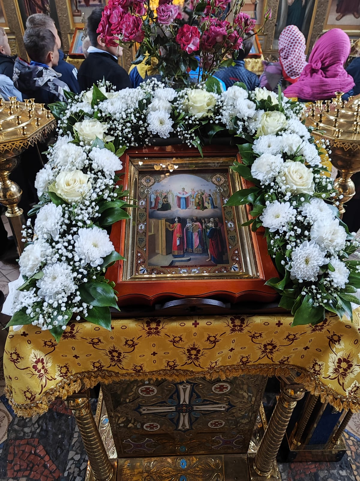 Детям предоставили возможность зажечь и поставить церковные свечи на главный подсвечник, напротив Царских врат, мысленно попросив Спасителя и Богоматерь о здоровье своих родных.
