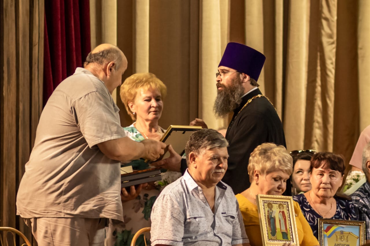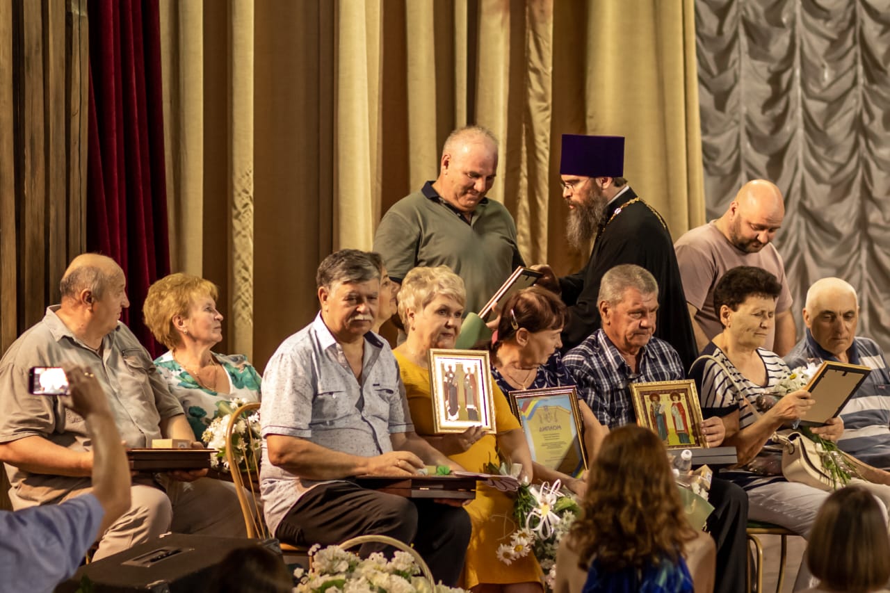 Благочинный приходов Александровск-Грушевского округа, настоятель Покровского кафедрального собора г. Шахты иерей Александр Теличкин, поздравляя юбиляров с Днем семьи, любви и верности, подарил супружеским парам иконы святых Петра и Февронии, ведь Всероссийский праздник появился благодаря муромскому князю Петру и его жене Февронии, которые жили в XIII веке. Эту семейную пару православные христиане почитают как покровителей семьи. Петр и Феврония стали образцами супружеской верности, взаимной любви и семейного счастья еще при жизни. По преданию, они умерли в один день – 25 июня (по новому стилю – 8 июля) 1228 года. Их тела, упокоенные в разных местах, чудесным образом оказались в одном гробу, что сочли чудом. Петр и Феврония канонизированы на Церковном Соборе 1547 года. Их мощи пребывают в Свято-Троицком монастыре в Муроме.