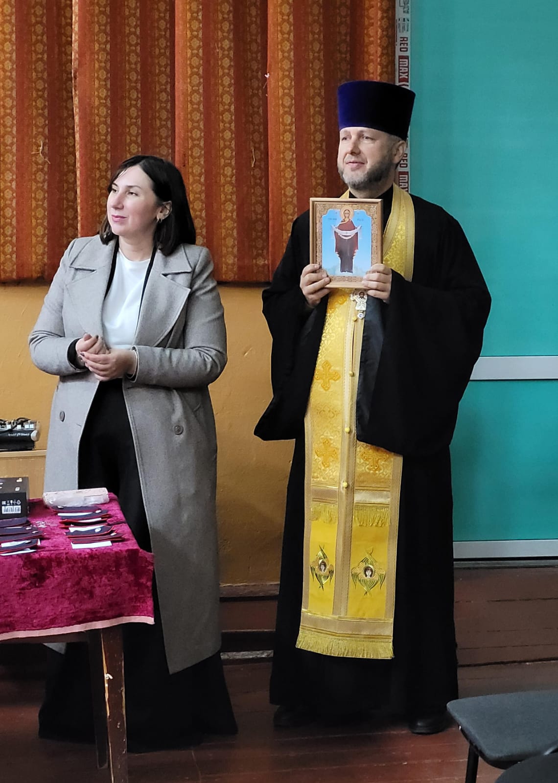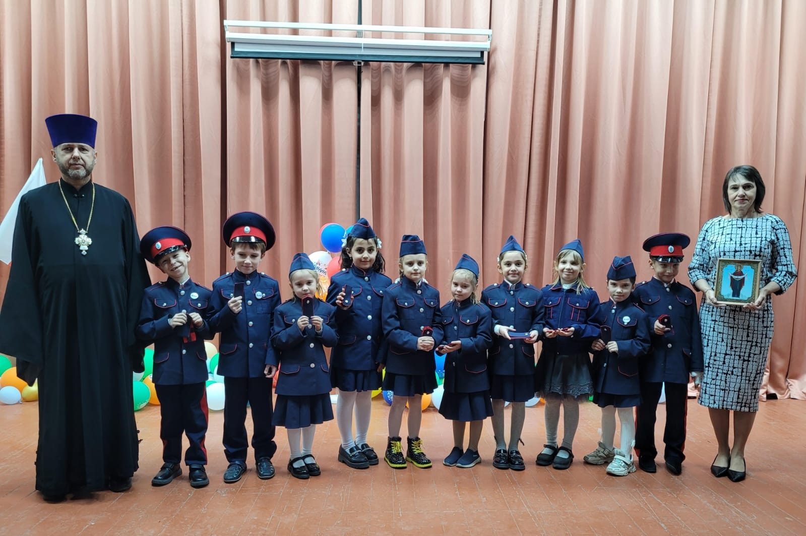 Священник поздравил и благословил юных казачат и классного руководителя, окропил святой водой ребят и погоны, затем подарил в класс образ Покрова Пресвятой Богородицы и пожелал жить и учиться по заповедям Божиим, сохранять традиции казачества и быть готовыми к защите Отечества.
