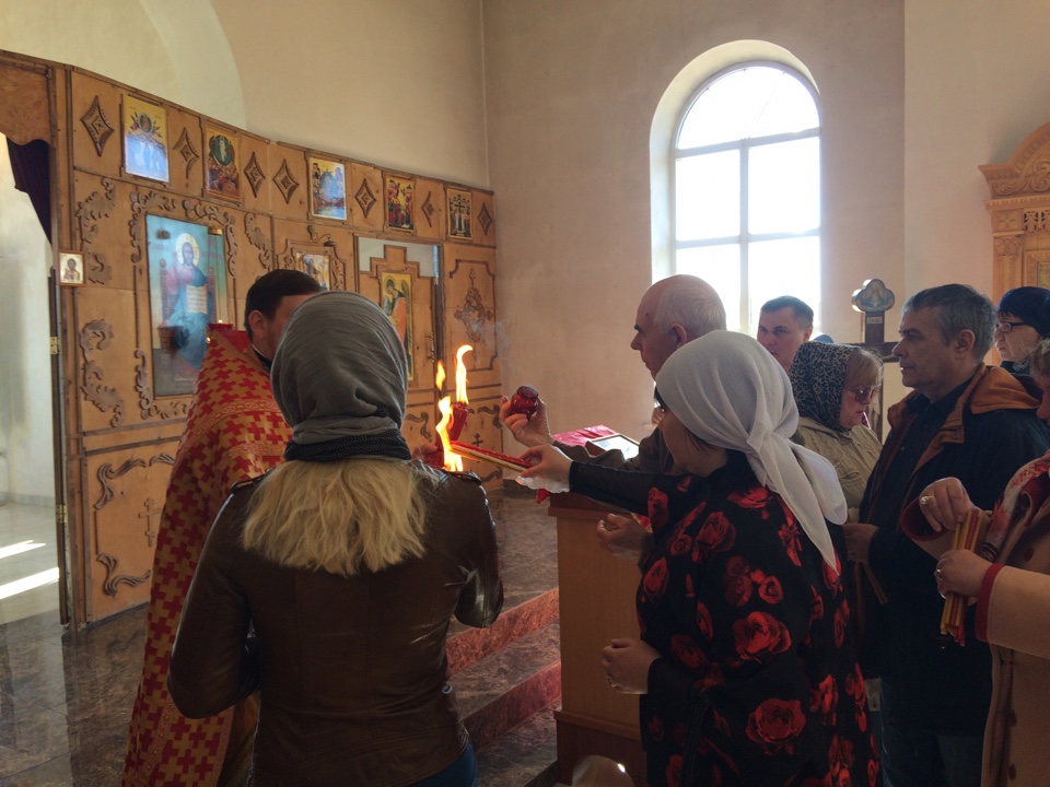 После окончания пасхального богослужения во второй день Пасхи благочинный приходов Донецкого округа раздал богомольцам Благодатный огонь из Покровского кафедрального собора города Шахты, который доставили из Святого града Иерусалима.