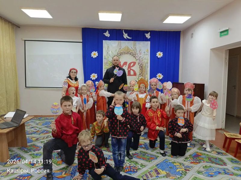 14 апреля 2026 года в Кашарском детском саду «Тополёк» в старшей группе «Колобок» и средней группе «Звёздочки» состоялся праздник «Пасха в гости к нам пришла». В рамках духовно-нравственного воспитания детей утренник посетил катехизатор Никольского храма слободы Кашары М.Н. Бурцев.