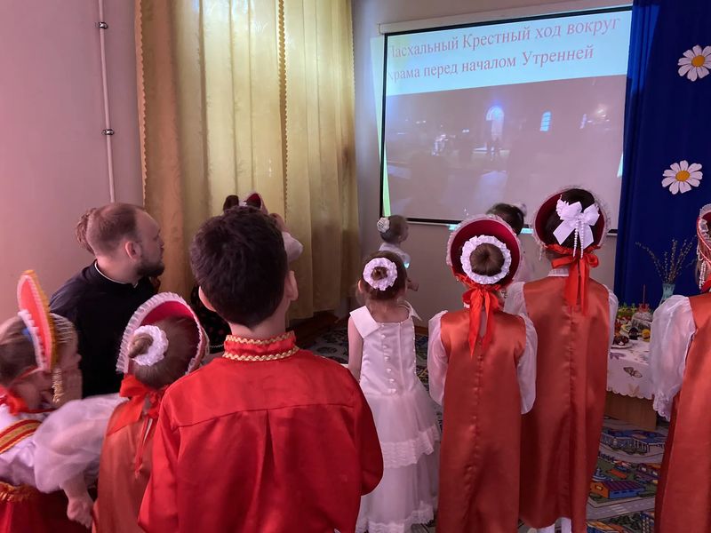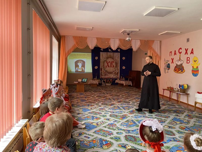 Михаил рассказал дошкольникам, что Пасха символизирует Воскресение Христово, и это время радости, надежды и обновления. Он объяснил, как важно в этот период быть добрыми, помогать друг другу и делиться радостью. В доступной форме дети познакомились с историей и традициями празднования Пасхи, узнали о её символах — крашеных яйцах и куличах.