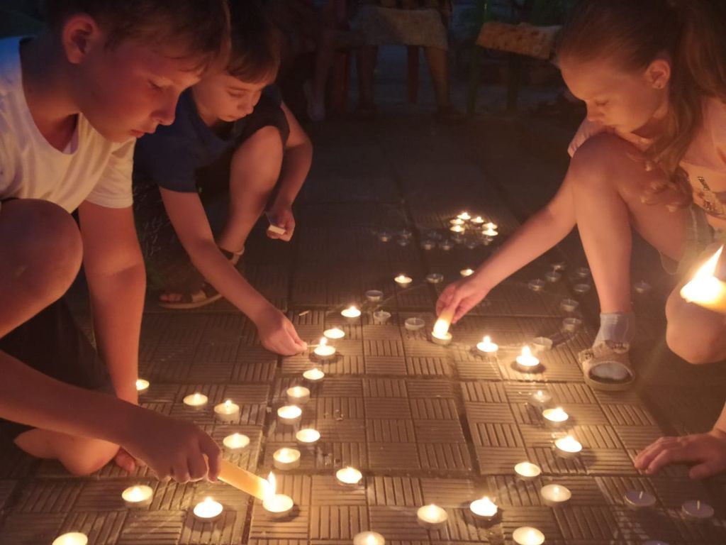 По благословению благочинного приходов Нижнедонского округа протоиерея Сергия Яценко с целью патриотического воспитания и сохранения исторической памяти, юные прихожане храма Архистратига Михаила пос. Каменоломни Октябрьского района при поддержке взрослых в память воспоминаемого события, выложили из свечей «голубя мира».