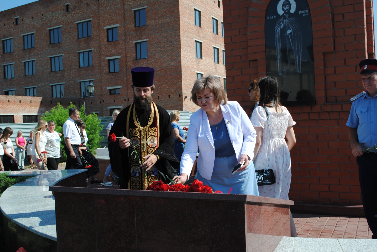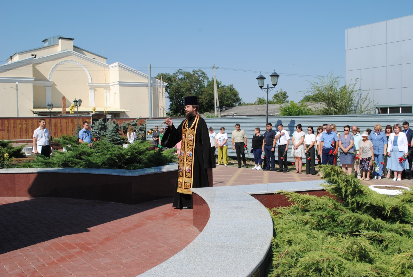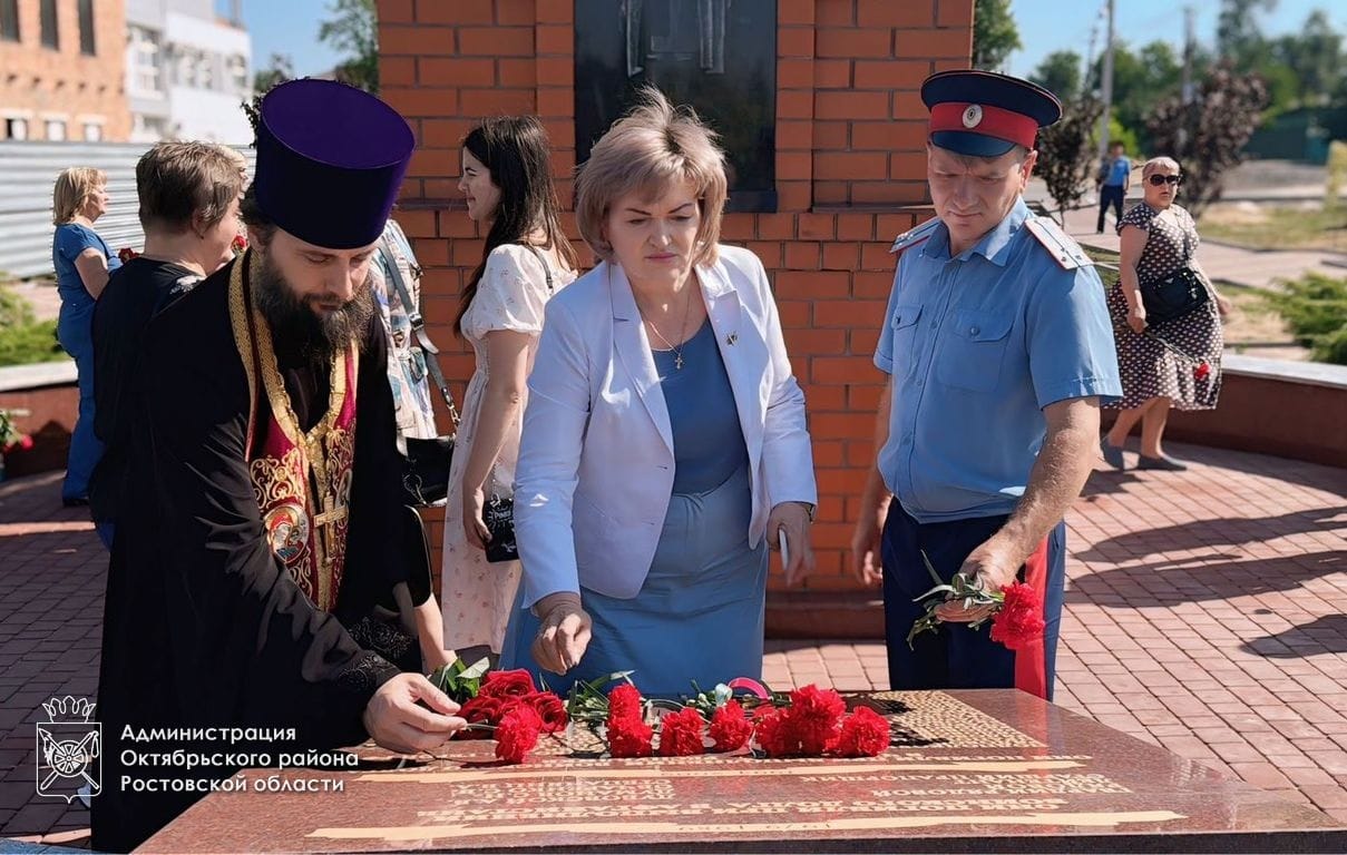Благочинный приходов Нижнедонского округа протоиерей Сергий Яценко совершил панихиду по усопшим воинам, в годы военных конфликтов смерть принявших, после чего участники мероприятия почтили память погибших минутой молчания и возложили венки и живые цветы к мемориалу погибших героев.