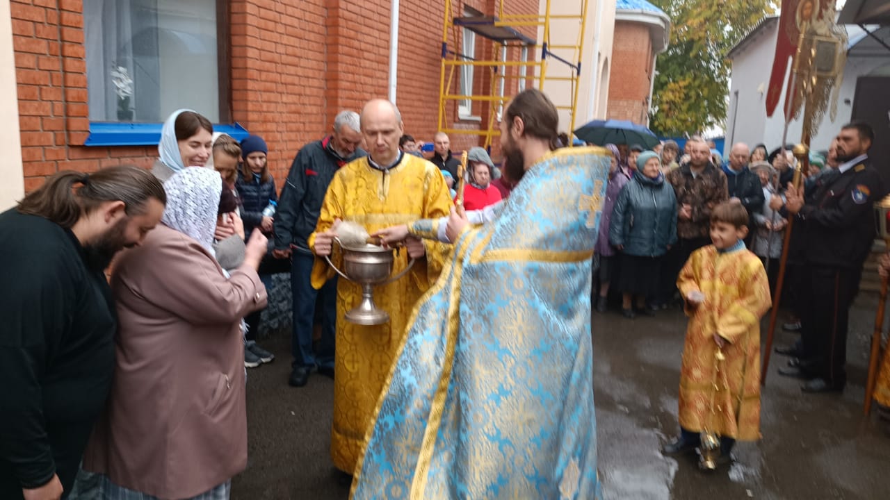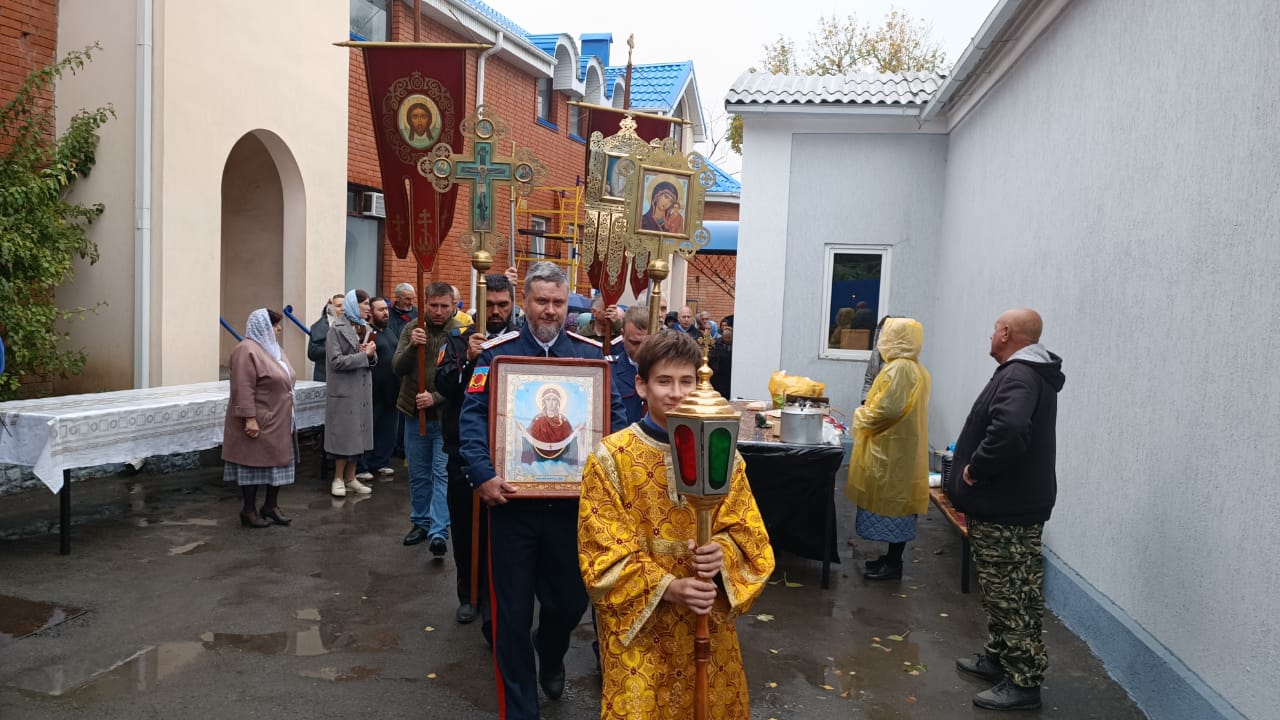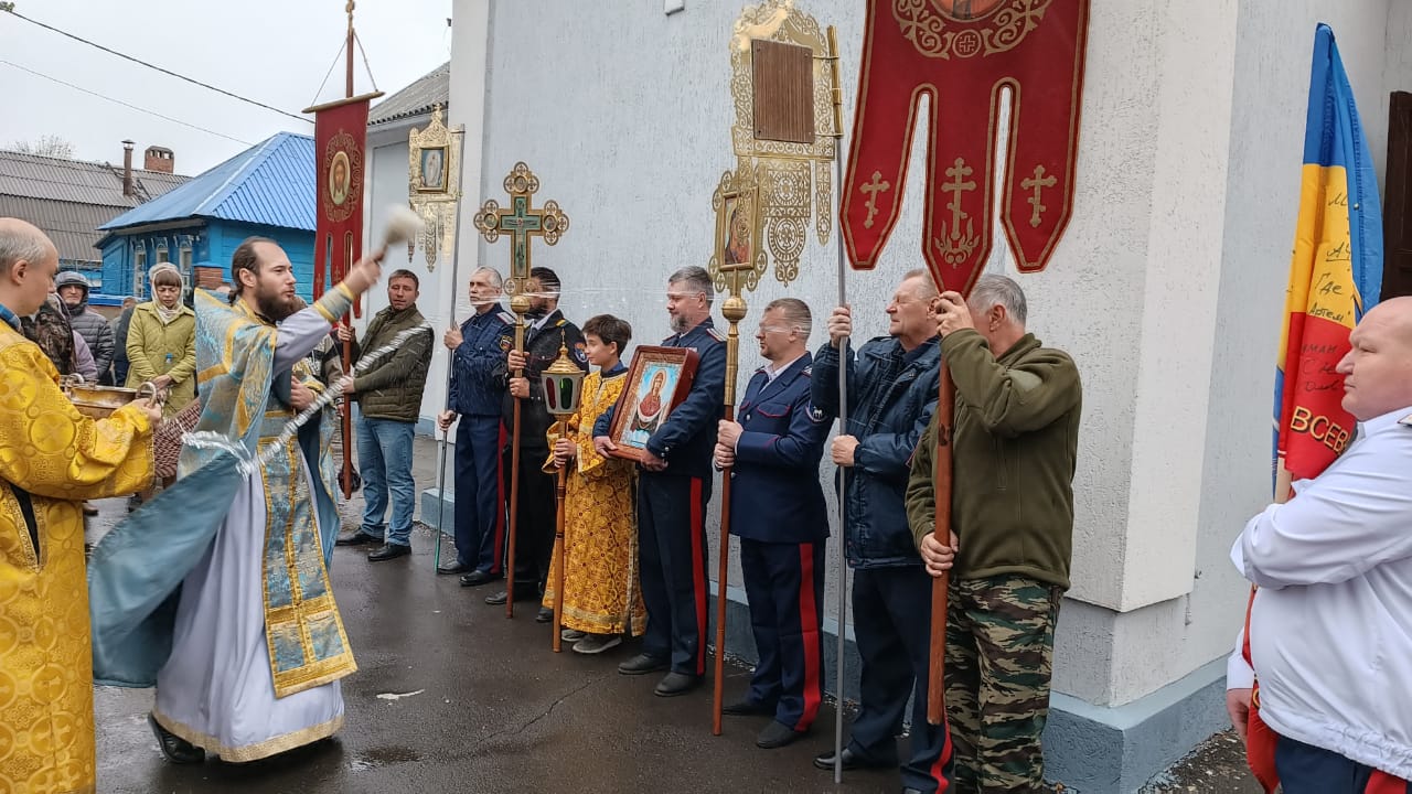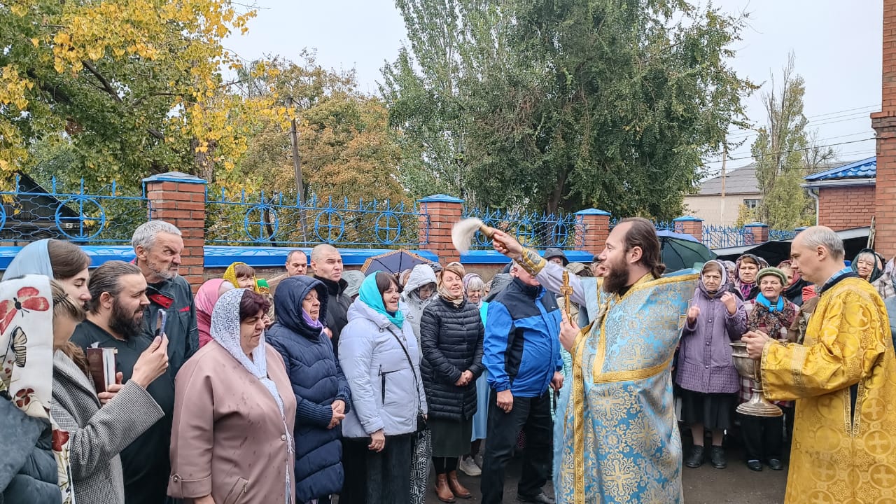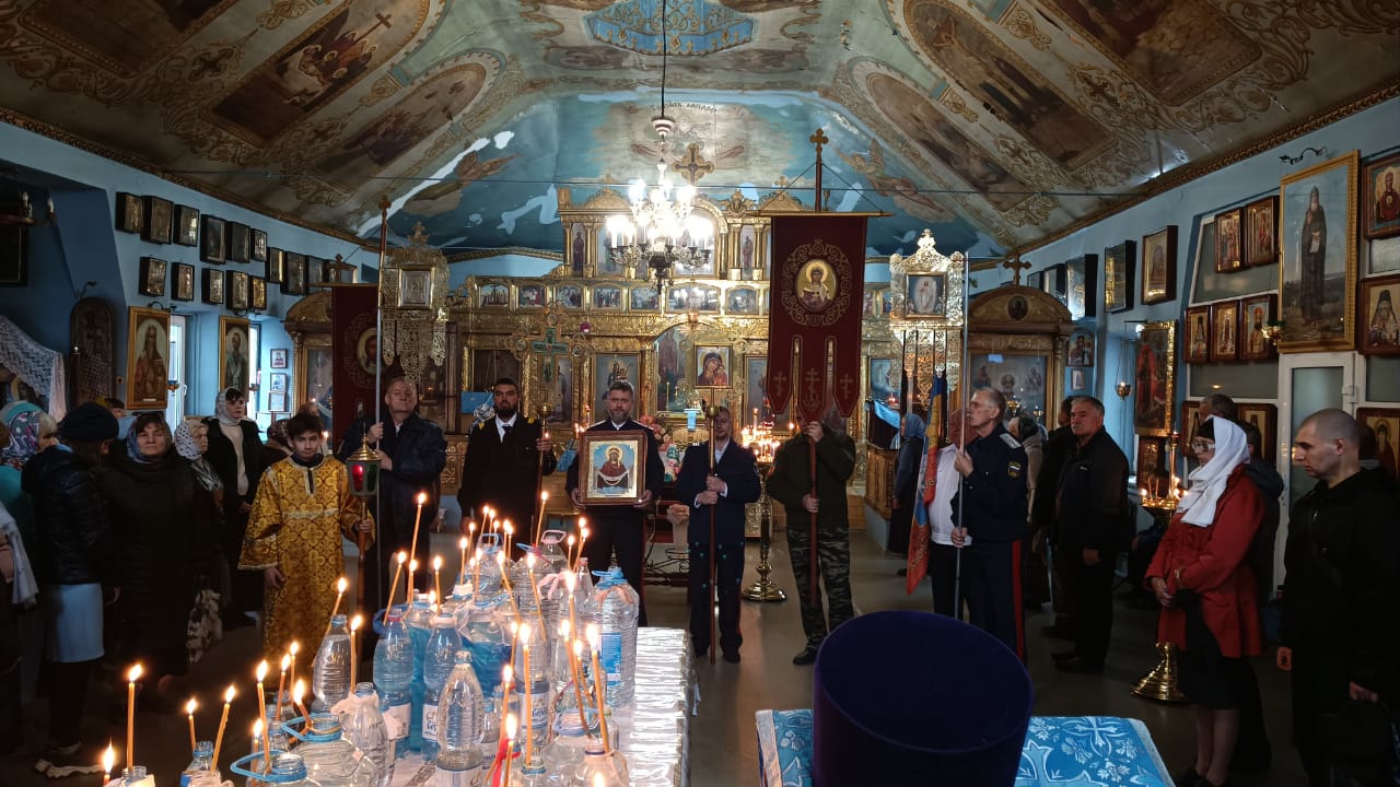 После Божественной литургии был совершен водосвятный молебен с чтением акафиста Покрову Божией Матери, а также крестный ход, в организации которого активного помогали представители Казачьей организации «Казачье единство Всевеликого Войска Донского» в лице атамана Андрея Сергеевича Готовцева и его помощников.