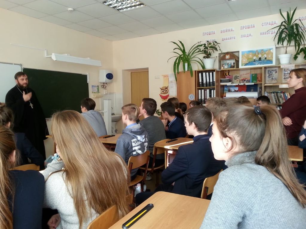 Настоятель храма Георгия Победоносца поселка Новозарянский иерей Сергий Липень в рамках работы с молодежью с пастырским визитом посетил среднюю общеобразовательную школу № 5.