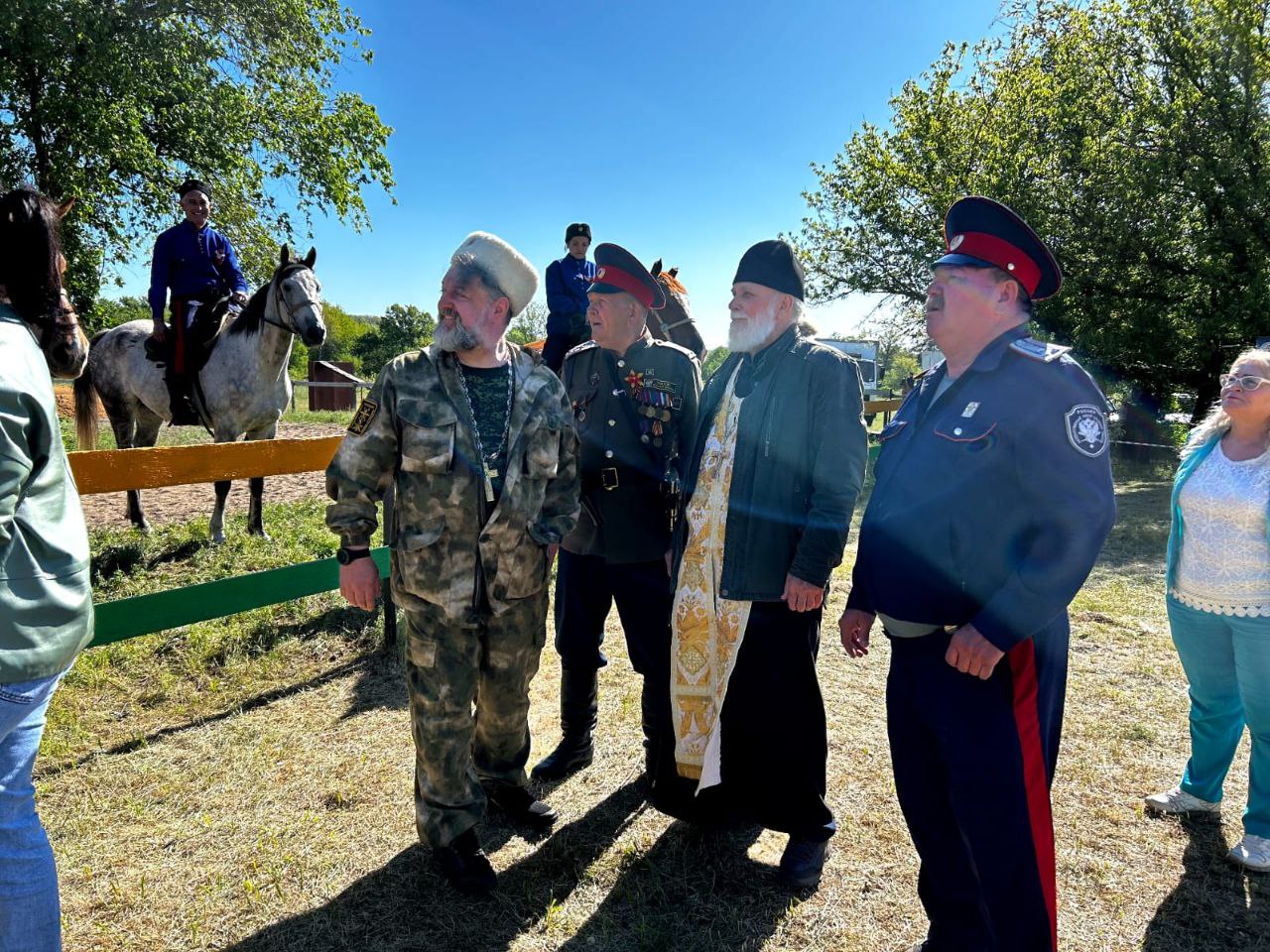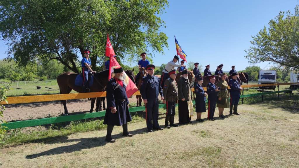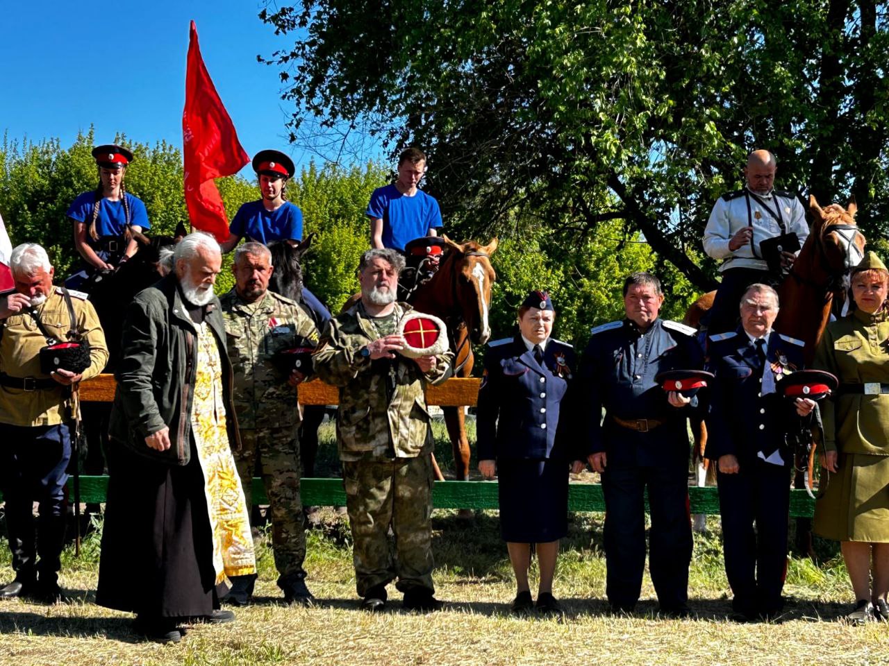 На подворье клуба ХКО «Красновское» настоятель храма преподобного Серафима Саровского Каменского благочиния протоиерей Константин Баранов благословил участников конного перехода в честь 80-летия Победы.
