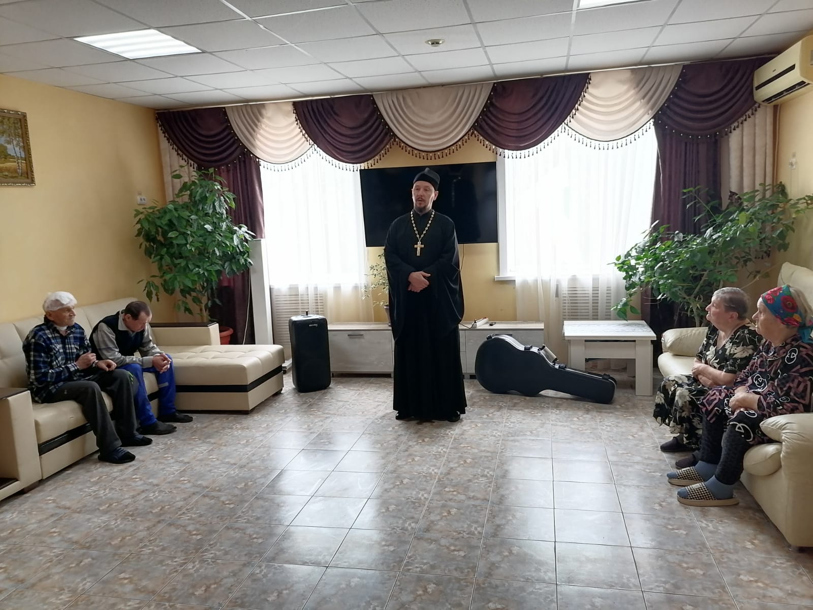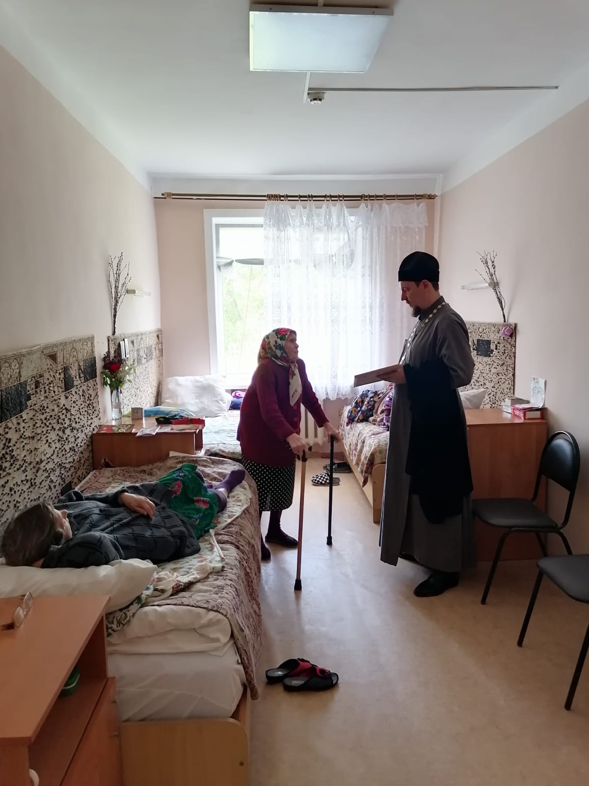 Отец Роман поздравил собравшихся в актовом зале жильцов учреждения с Пасхой, Светлым Христовым Воскресеньем, пожелал здравия, бодрости и крепости духа, а также посетил в палатах и побеседовал с лежачими больными, теми, кто не смог по состоянию здоровья присутствовать вместе со всеми.