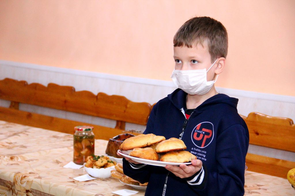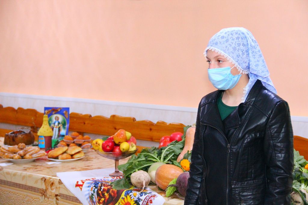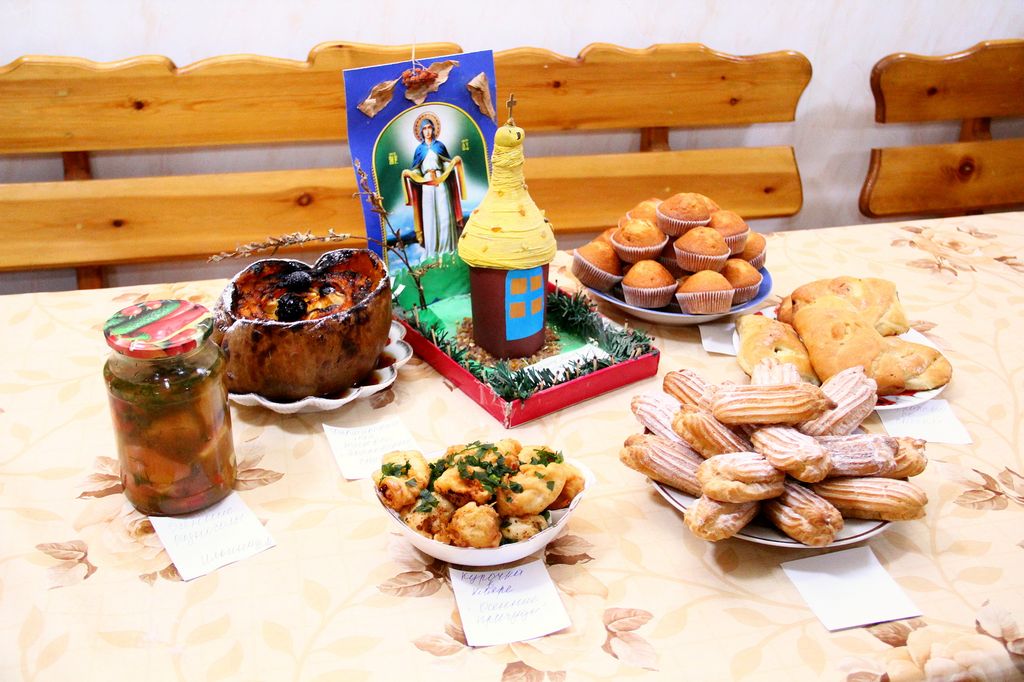 Воспитанники воскресной школы подготовили творческие поделки и кулинарные изыски: курочка в кляре «Покровские вкусности», фаршированная фруктами тыква «Покровский снежок», пирожки со снегом (творогом), пирожные и кексы, композиция из овощей и зелени. Учащиеся читали стихи и пели песни, посвященные Божией Матери.