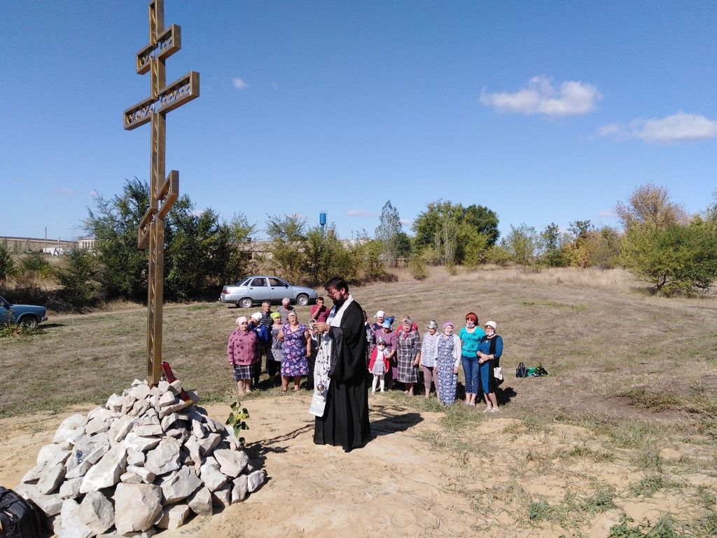 Жители хут. Калашников Кашарского района собрались рядом с установленным перед населенным пунктом крестом для совершения чина благословения и освящения.
