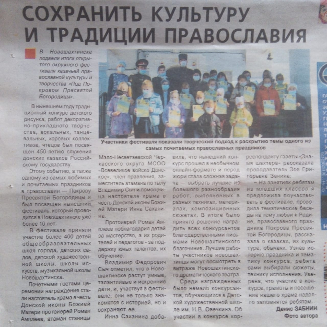 Благочинный приходов Новошахтинского округа, председатель епархиального отдела по взаимоотношению Церкви с обществом протоиерей Роман Амплеев выражает особую благодарность корреспонденту газеты «Знамя шахтера» Юлии Романовне Середяк, редактору газеты «Знамя шахтера» Любови Семеновны Наумовой, директору Новошахтинского театра Соповой Светлане Николаевне предоставившей свой сайт для размещения информации о фестивале «Под покровом Пресвятой Богородицы».
