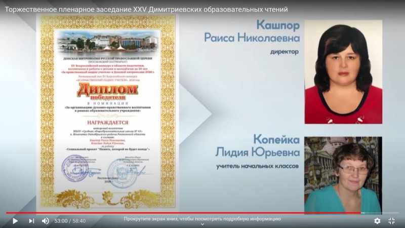 Дипломами победителей в номинации «За организацию духовно-нравственного воспитания в рамках образовательного учреждения» регионального этапа XV Всероссийского конкурса в области педагогики, воспитания и работы с детьми и молодежью до 20 лет «За нравственный подвиг учителя» в 2020 году награждены авторские коллективы: