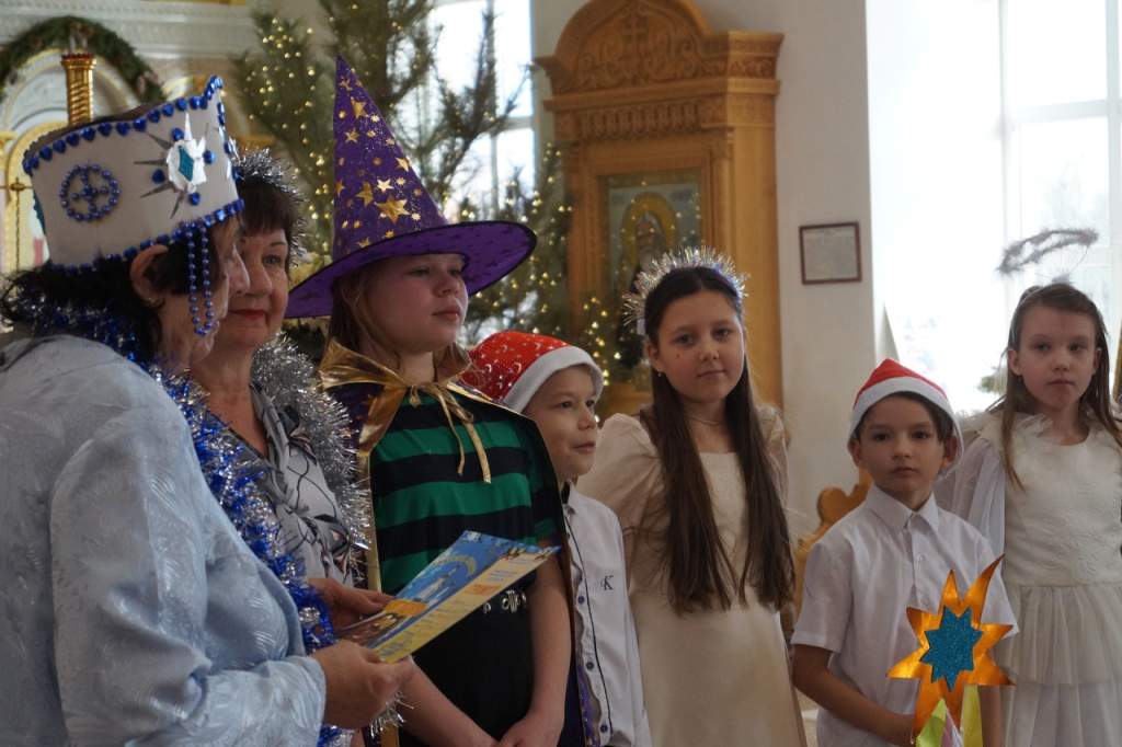 Иерей Владимир поздравил детвору и родителей с чудесным праздником Рождества, рассказал о Святках, о таинстве Крещения.