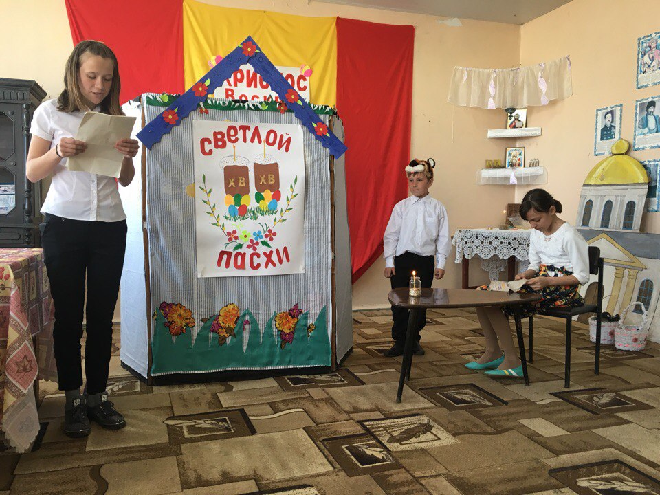 Трудами Сычёвой Надежды Николаевны был подготовлен праздничный сценарий, в котором ребята показали пасхальную сценку, пели песни, читали стихи и играли в игры. Отец Игорь поздравил всех присутствующих с праздником Святой Пасхи, рассказав историю этого величайшего праздника. Священник поблагодарил ребят за выступление и в качестве подарка для детей был приготовлен сладкий стол.