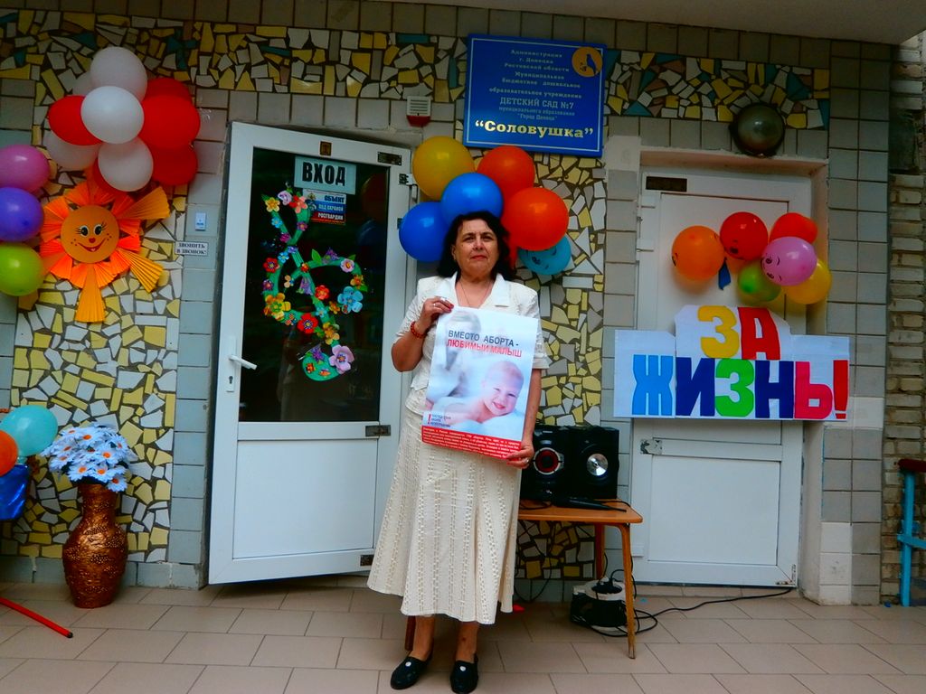 Открыла заседание помощник благочинного Фартанова Р.И., которая рассказала о важности участия в данной акции Родительского духовного клуба и актуальности сохранения жизни – драгоценного божиего дара. Выступила Рагозина И.В. с проектом буклета «Весь мир начинается с мамы» для вручения на городской акции. Председатель клуба «Свет Добра» Кудинова С.И. ознакомила со сценарием акции, а Воротынцева Т.В. художественный руководитель подготовила с воспитателями Мадай Е.В., Вавиловой Е.В., Серегиной Т.Г., Кибальченко Ю.Н. и родителями выступление подготовительной группы детей «Жизнь – божий дар, сохрани ее!» в парке города Донецка.