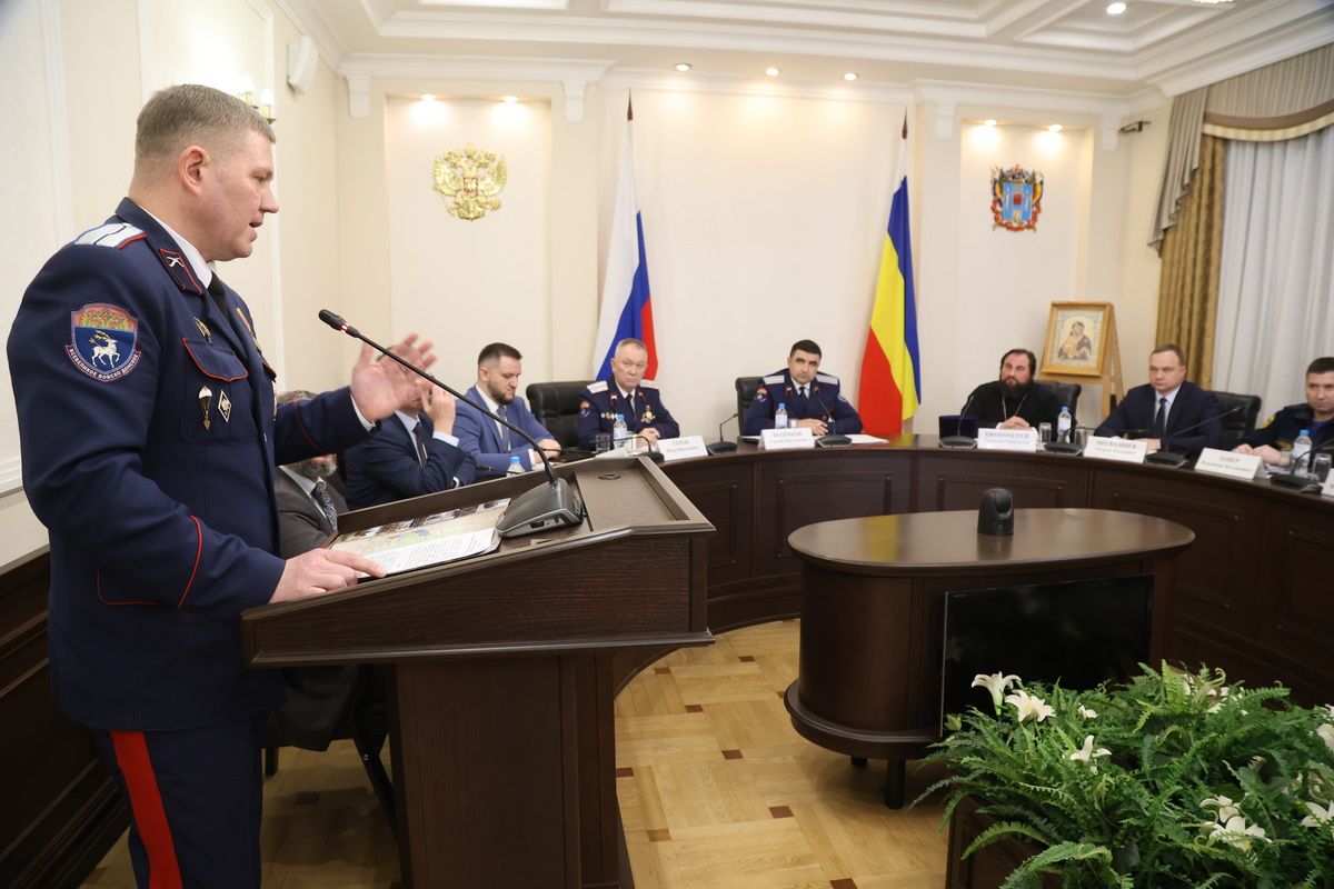 О деятельности казачьих дружин войскового казачьего общества «Всевеликое войско Донское» в мероприятиях по профилактике терроризма и экстремизма в 2024 году докладывал начальник управления казачьих дружин ВКО «Всевеликое войско Донское» Иван Рысев.
