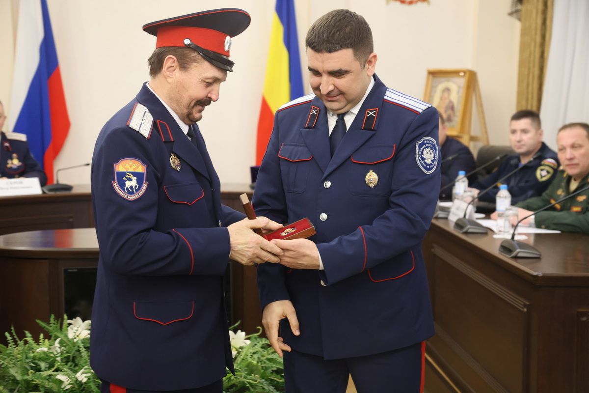 В начале мероприятия Сергей Бодряков вручил благодарственные письма и награды губернатора Ростовской области, которыми за многолетнюю эффективную службу на благо Донского края и Всевеликого войска Донского отмечены сотрудники департамента по казачеству Ростовской области и дружинники казачьих дружин.