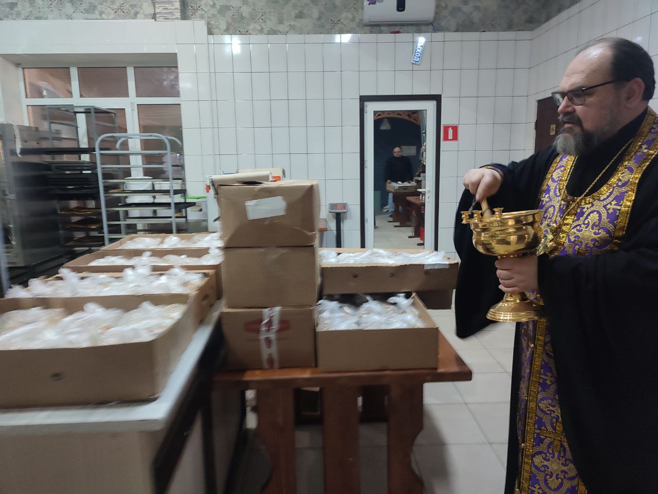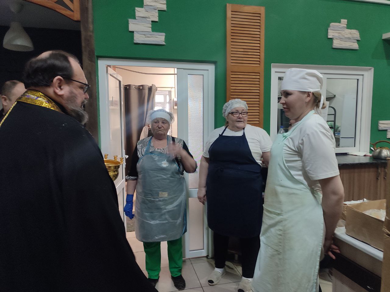По поручению командования штурмового отряда, от имени командования, протоиерей Василий вручил руководителям пекарни Москаленко Алексею Николаевичу и Синенко Марии Анатольевне благодарности, также окропил святой водой куличи и мясо, которое пожертвовало руководство пекарни для наших бойцов.