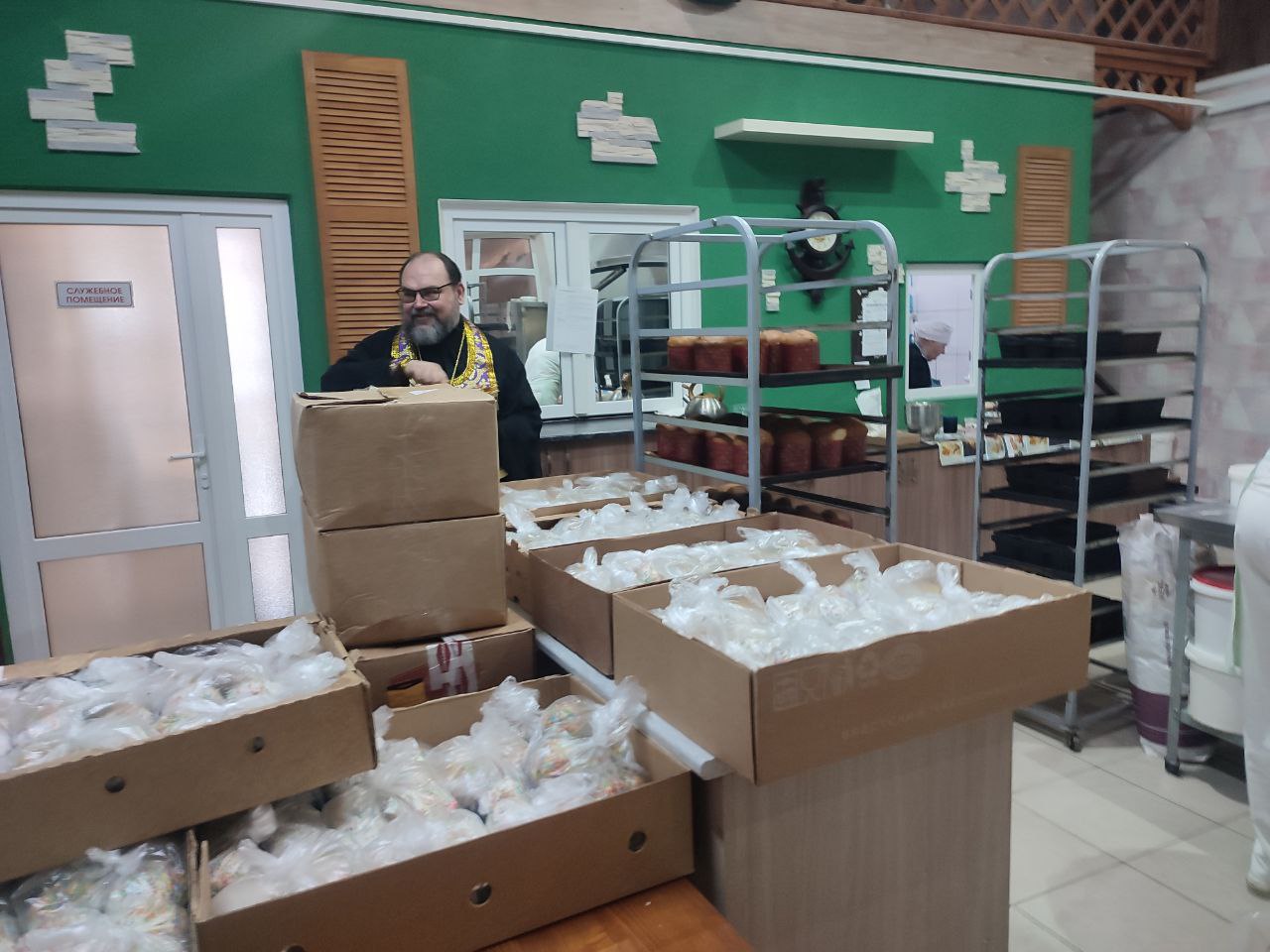 Окружной священник Донецкого округа протоиерей Василий Хадыкин посетил пекарню «Мельница» г. Красный Сулин. Вот уже третий год подряд коллектив пекарни выпекает, на благотворительной на основе, сотни куличей для бойцов казачьего штурмового отряда «Шторм» 102 гвардейского полка 150-ой гвардейской мотострелковой дивизии. В этом году было испечено 400 куличей.