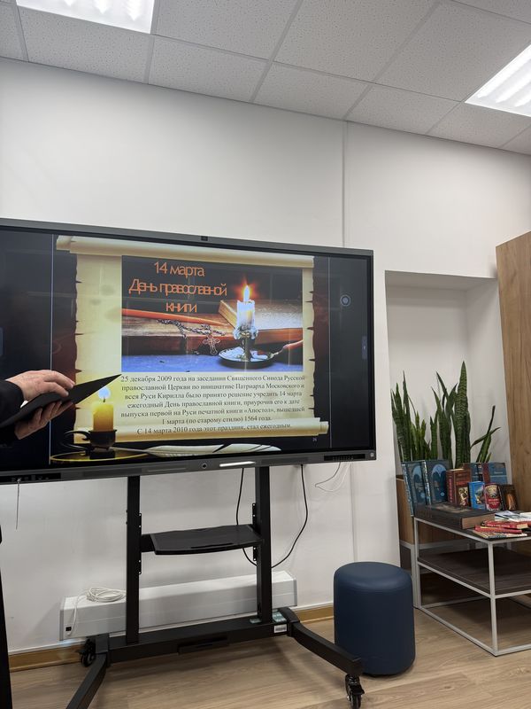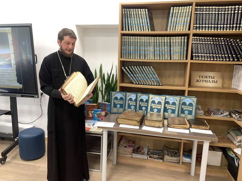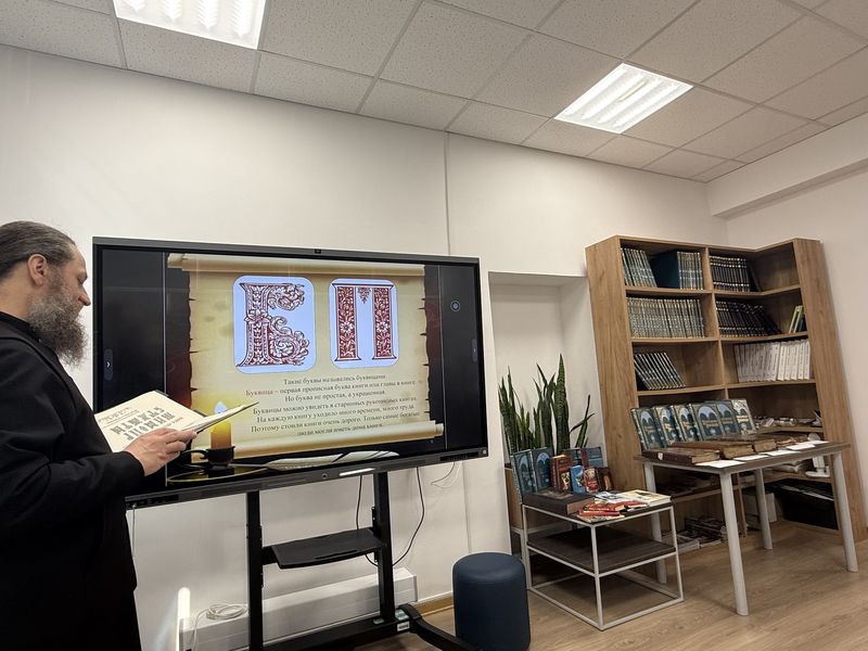 В начале учащимся была продемонстрирована видео- презентация«Первая русская печатная книга». После чего отец Александр рассказал какие книги называют Богослужебными, а также о пользе для человека от чтения духовной литературы.