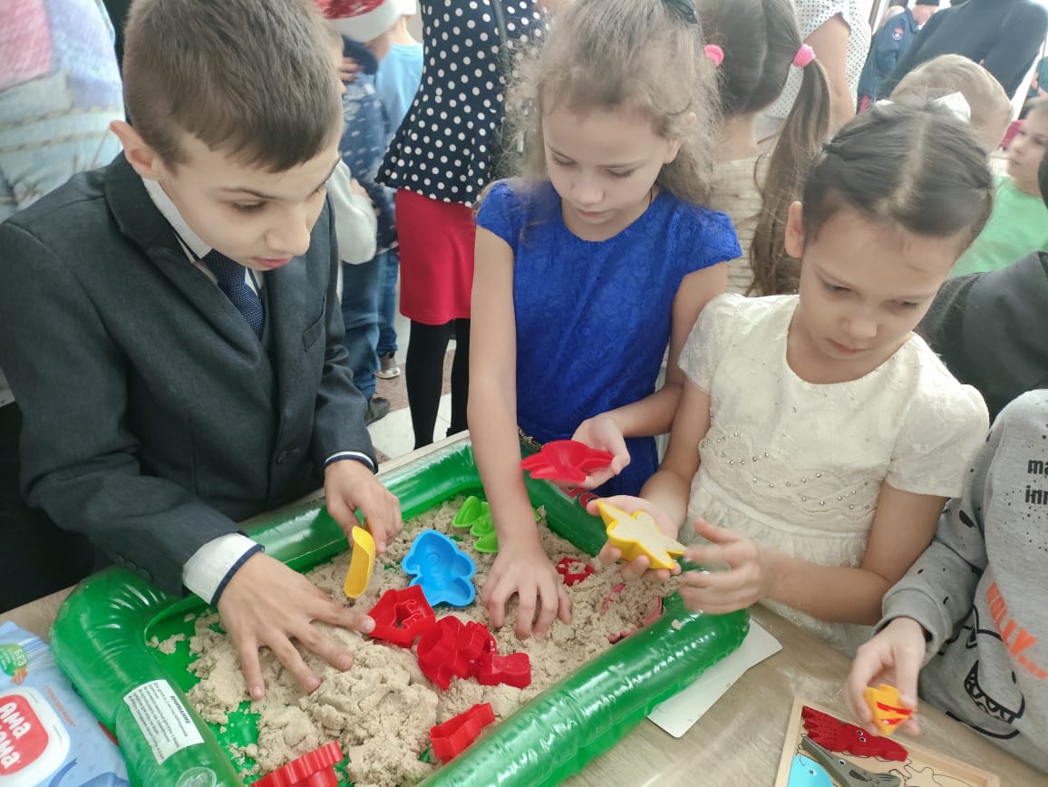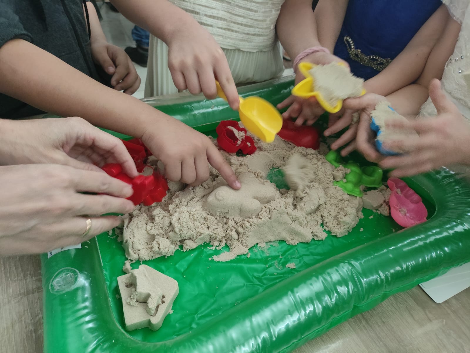 - развивающая игра с «кинетическим» песком, надувной песочницей и формочками;