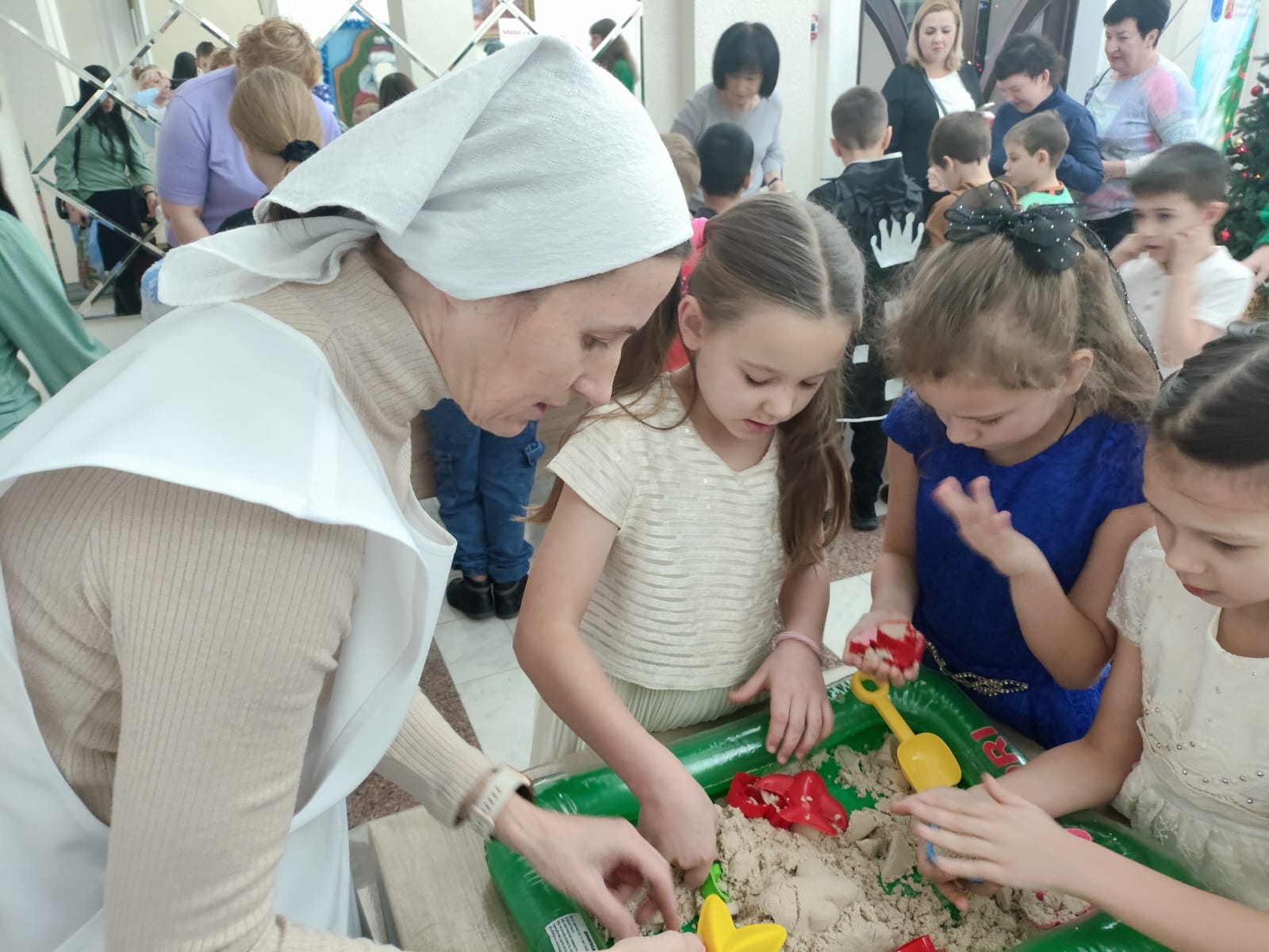По благословению благочинного приходов Нижнедонского округа протоиерея Сергия Яценко, сестры милосердия Марфо-Мариинского сестричества храма Архистратига Михаила п. Каменоломни организовали для детей игровую зону и провели мастер-классы: